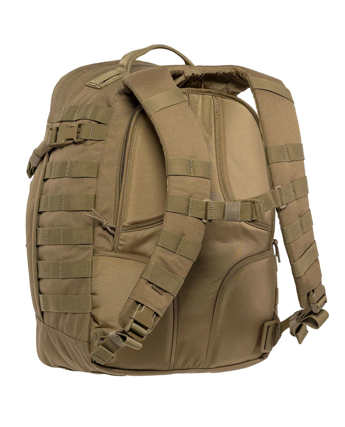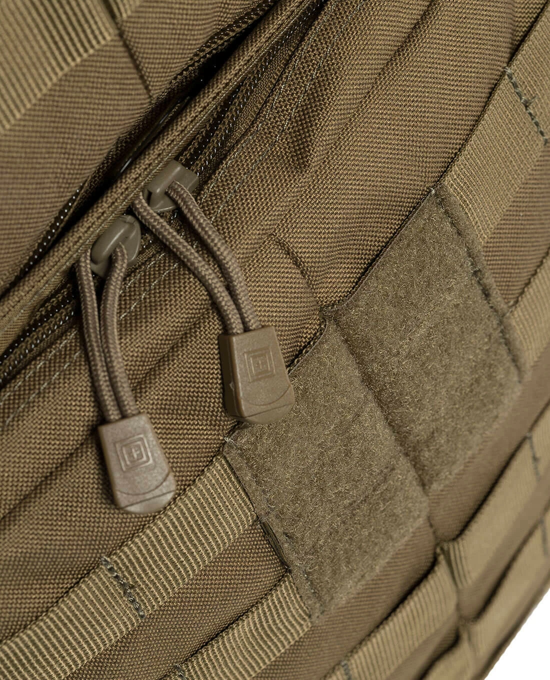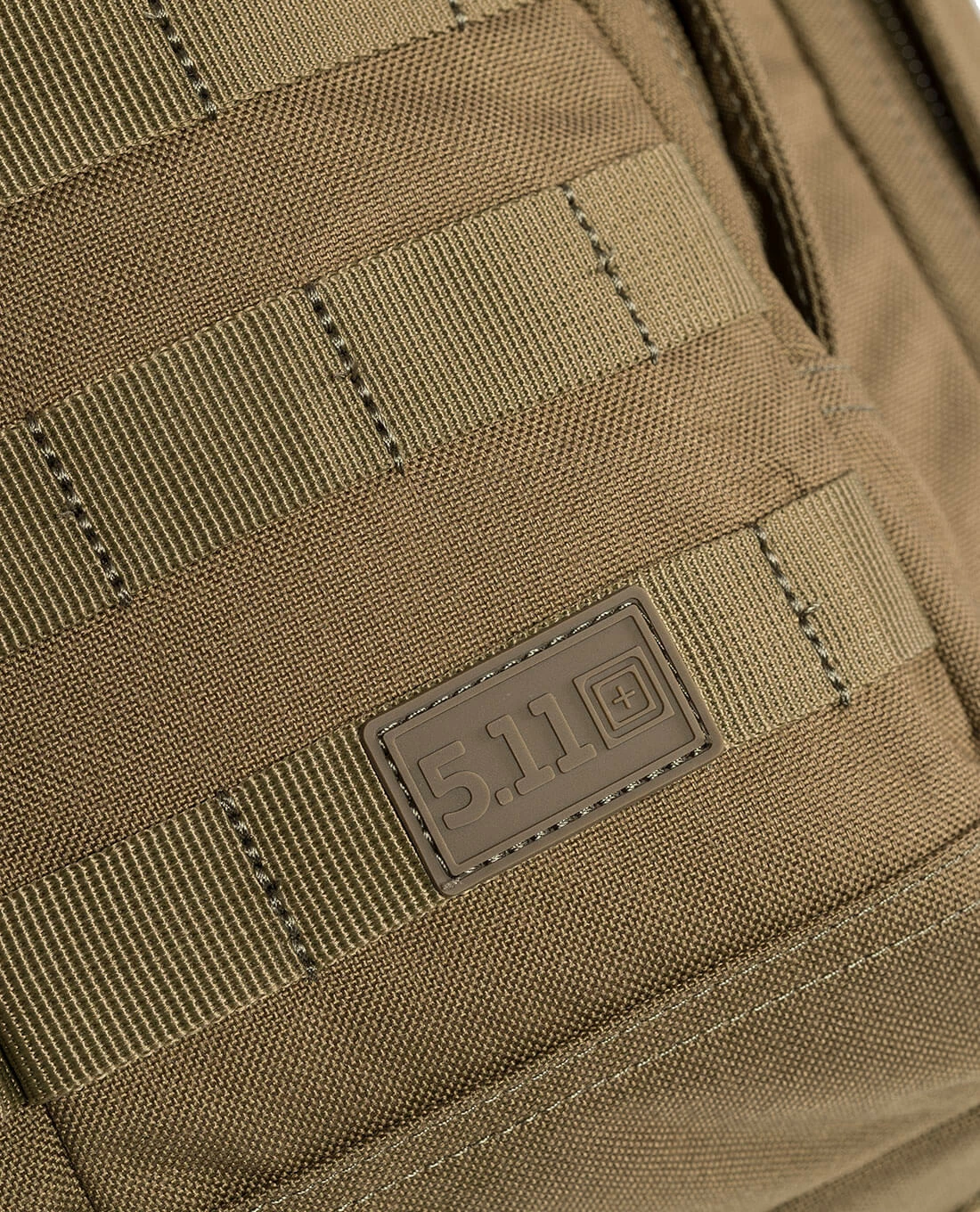 Der Look des Rucksacks wird maßgeblich durch das 5.11 typische Centre Line Design bestimmt, das sich durch das Zusammenlaufen der M.O.L.L.E.-Streifen auf der Voderseite des Rucksacks ergibt. Das M.O.L.L.E.-System wurde hier voll ausgeschöpft und sowohl über die gesamte Vorderseite, als auch über die Seiten und die Bodenplatte geführt. Die Möglichkeiten, kleine Tac Pouches und Zubehör anzubringen sind also maximiert und das typisch taktische Element kann frei bespielt werden. Der Rucksack ist übrigens nach wie vor auch mit dem 5.11 Tier System kombinierbar.