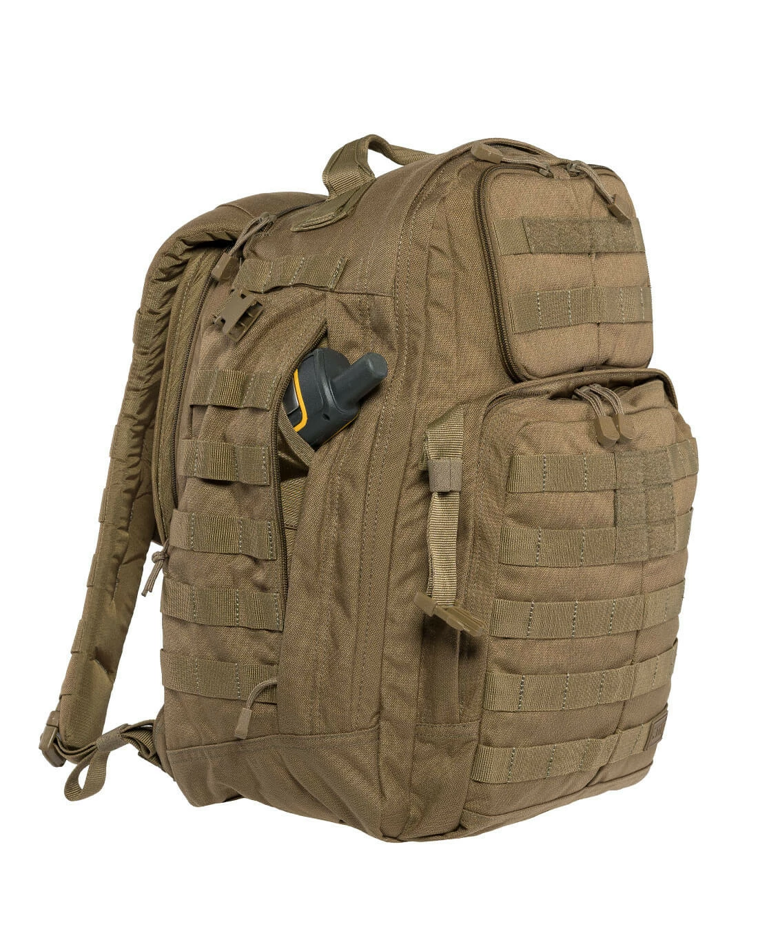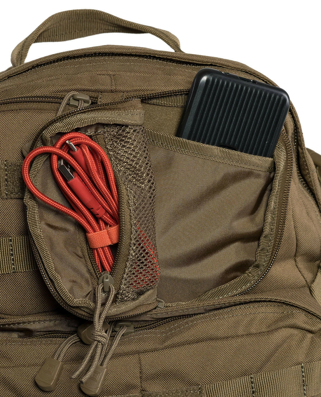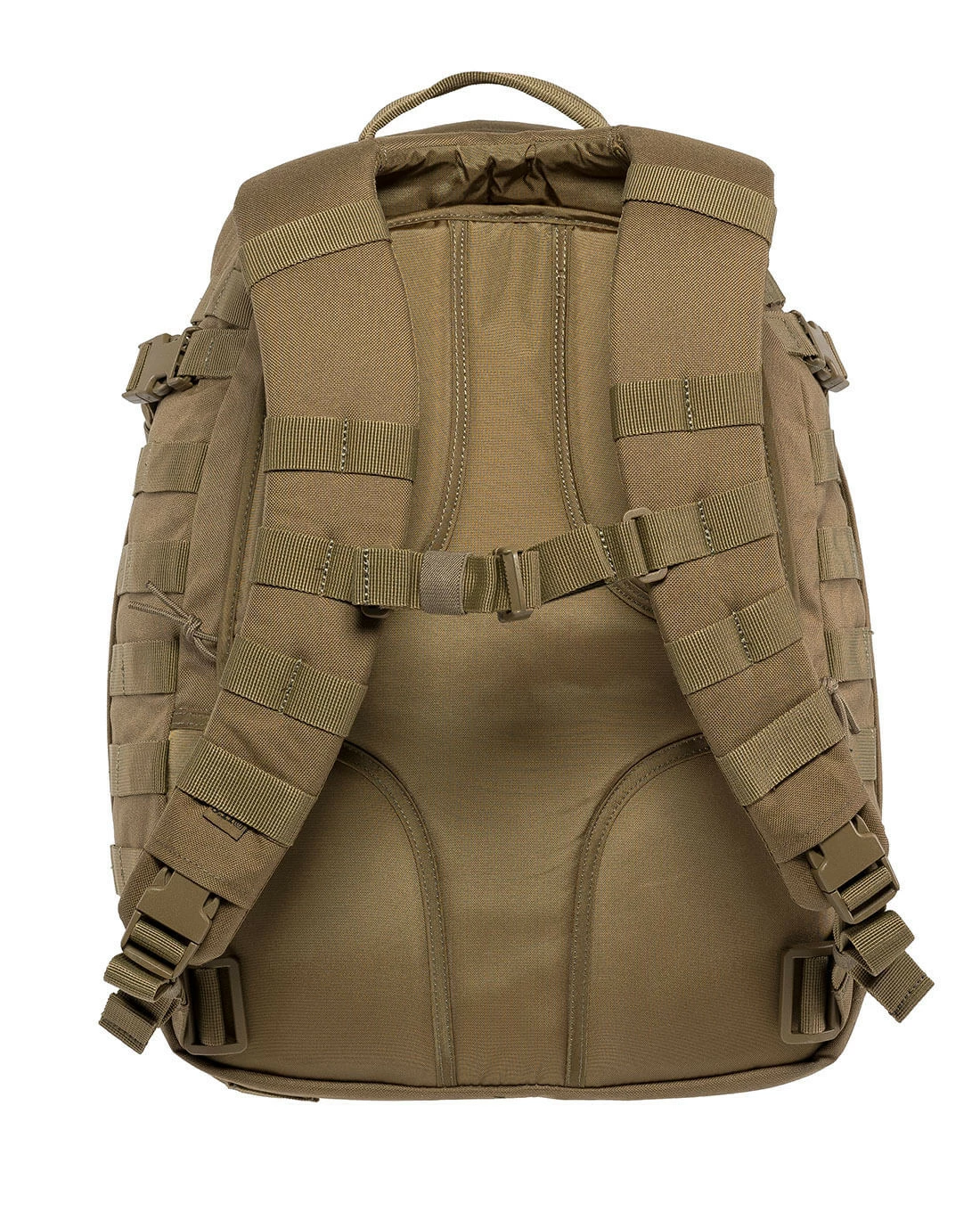 Der Look des Rucksacks wird maßgeblich durch das 5.11 typische Centre Line Design bestimmt, das sich durch das Zusammenlaufen der M.O.L.L.E.-Streifen auf der Voderseite des Rucksacks ergibt. Das M.O.L.L.E.-System wurde hier voll ausgeschöpft und sowohl über die gesamte Vorderseite, als auch über die Seiten und die Bodenplatte geführt. Die Möglichkeiten, kleine Tac Pouches und Zubehör anzubringen sind also maximiert und das typisch taktische Element kann frei bespielt werden. Der Rucksack ist übrigens nach wie vor auch mit dem 5.11 Tier System kombinierbar.