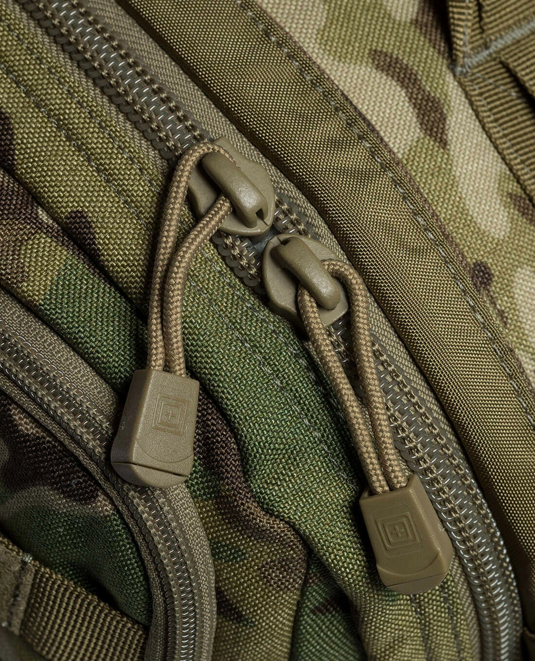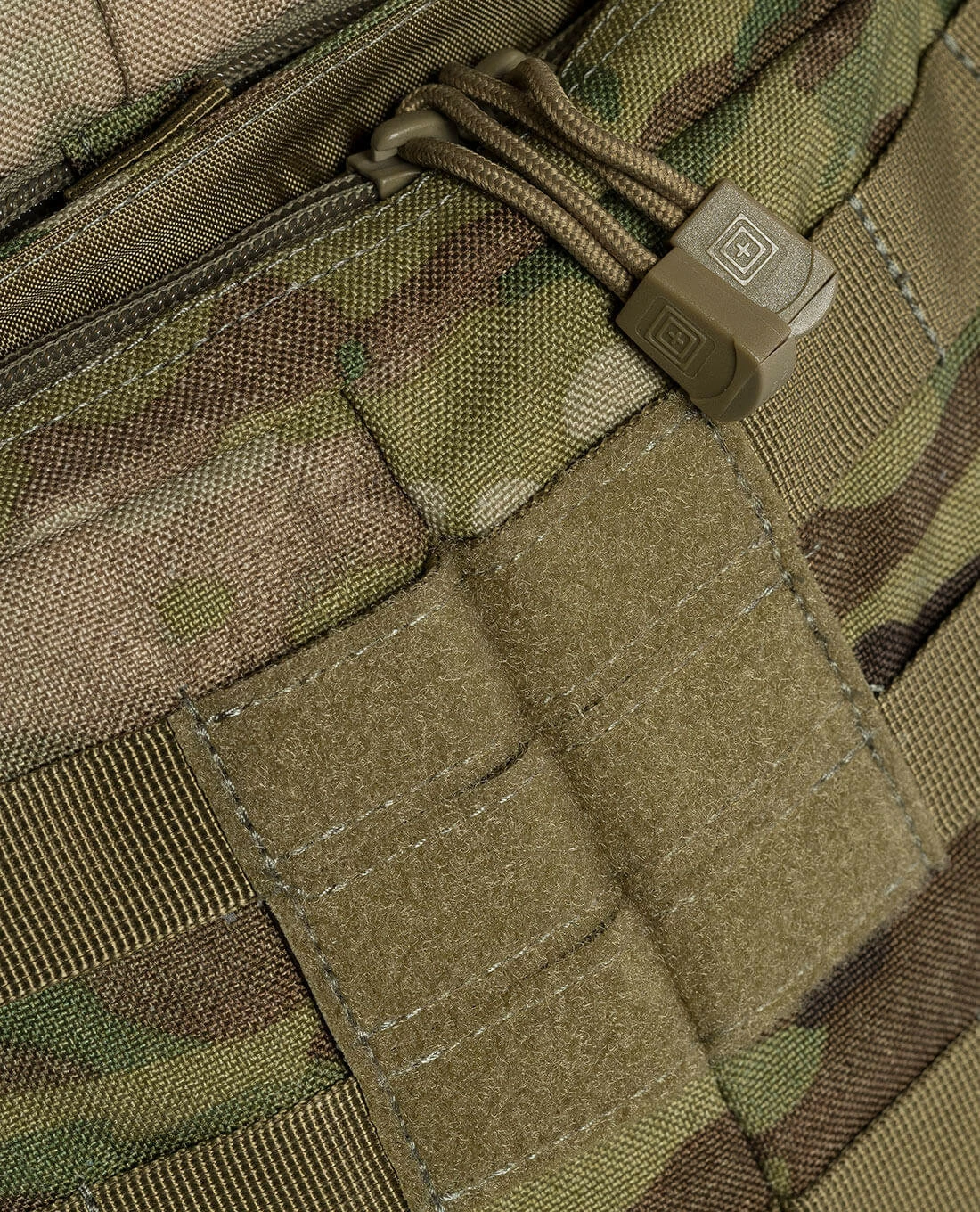 Geblieben ist das signifikante Aussehen des Daypacks, das weiterhin von seinem M.O.L.L.E.-System bestimmt wird. Die M.O.L.L.E.-Streifen wurden beim Rush24 üppig verwendet, schließlich soll der taktische Backpack so versatil wie möglich sein. Die Gurtband-Streifen überziehen die gesamte Frontseite, die Seiten und die Bodenplatte und geben eine Menge Platz frei für die üblichen Tac Pouches und Magazintaschen eines Standard-Einsatzes. In der Mitte treffen sie sich symmetrisch und bilden so das typische 5.11 Centre Line Design.