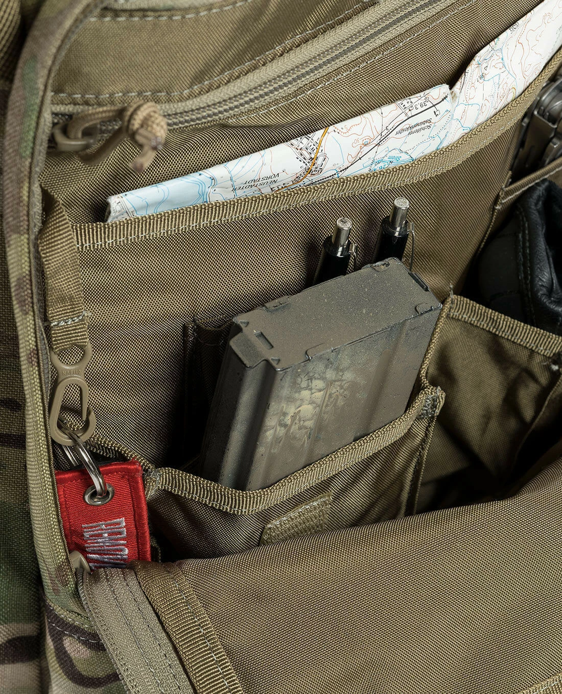 Auf der Vorderseite des Rucksacks dienen zwei aufgesetzte Front-Taschen dem Verstauen von EDC-Kleinteilen und Dokumenten. Mit einigen Einschubfächern und einem Reißverschlussfach ist vor allem das untere, größere Fach hilfreich für ein ordentliches Verstauen von Kleinkram. Das größere Frontfach hat bei der 2.0 Version des Rush24 eine weitere Funktion, es versteckt nämlich ein verdecktes Klettverschlussfach, in dem sensiblere Dokumente oder Kleinteile verstaut werden können. Das Fach ist von außen nicht zu sehen und darum gerade im Einsatz nützlich für das diskrete Verstauen von Ausrüstungsteilen.