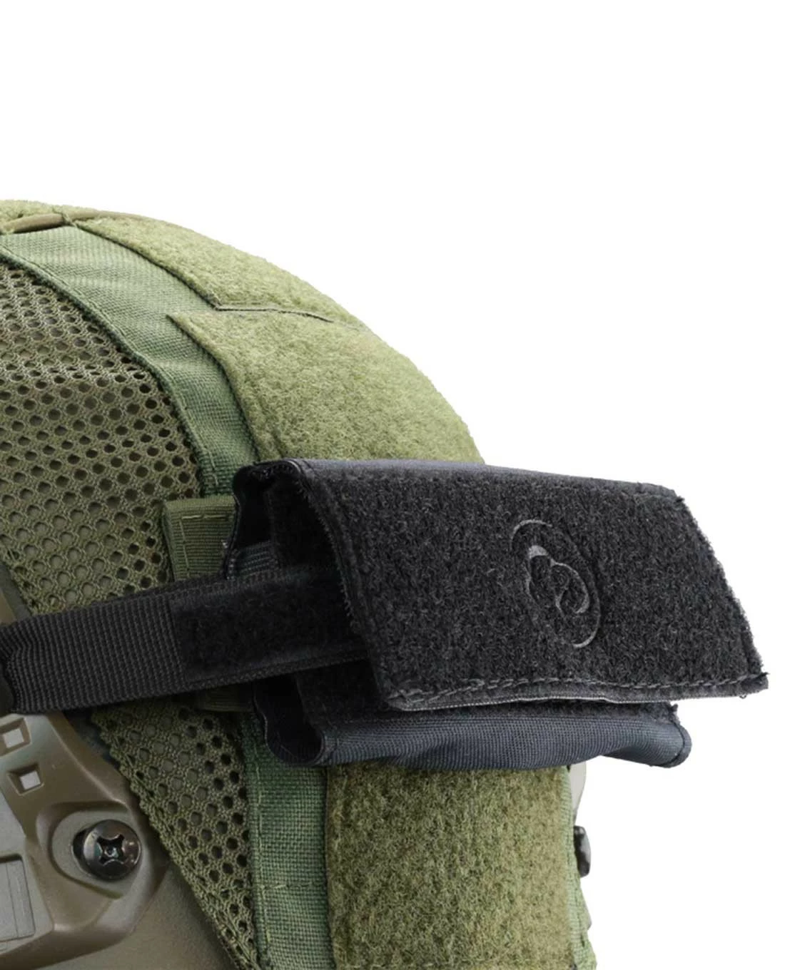 Die Gewichte sitzen sicher im Inneren der Klapp-Pouch und werden mit einem Gurtband über das CMR-1 Railsystem am Helm angebracht. Die Unterseite wird am Helm angeklettet. Die Außenseite ist mit einem Flauschklett belegt, an die weiterer Zubehör oder Patches angebracht werden können.