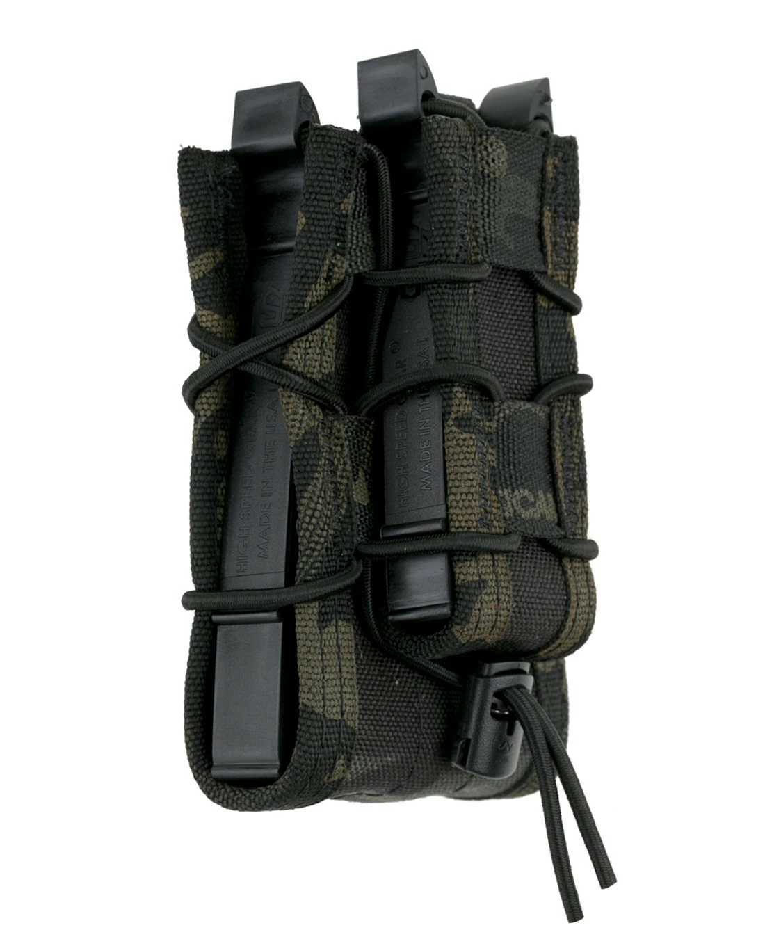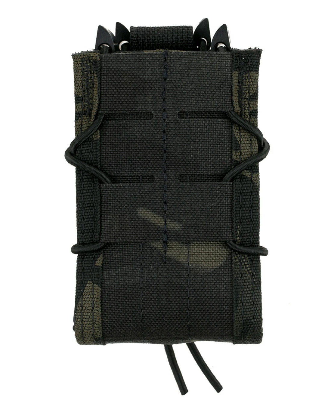 Beide Pouches sind aus widerstandsfähigem Cordura Nylon gefertigt und an den Seiten mit Spritzgusspolymer verstärkt. Ein Bungee Cord hält die Magazine an Ort und Stelle, ein weiteres Sicherungssystem ist nicht notwendig, es sei denn, Sie wünschen zusätzliche Absicherung. In dem Fall können die Magazine mit einer schließbaren Lasche am oberen Ende mit Klettverschluss gesichert werden.