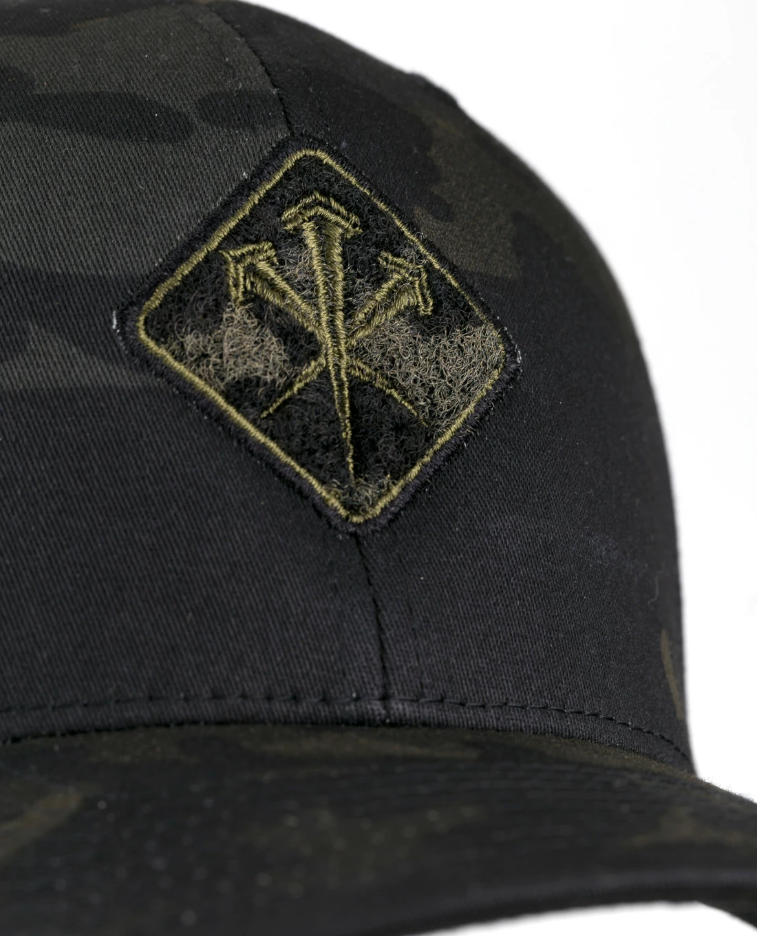 – 5 x 5 cm rahmengenähte Raute aus MultiCam Black-Flauschklett mit dem markanten LMSG Nails Logo