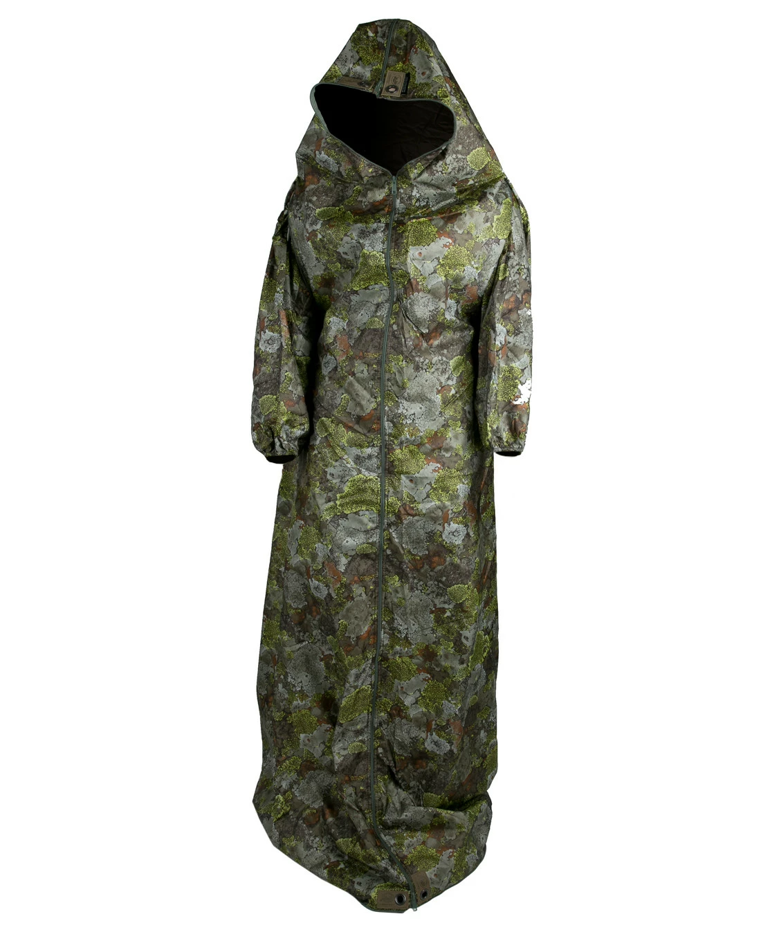 Die Beine ausstrecken zu können, wenn man lange warten muss, ist Gold wert. Der Jerven Hunter ist 102×220 cm groß. Die beidseitig zu öffnenden Reißverschlüsse bieten eine Reihe von Möglichkeiten. Außerdem ist er leicht, er wiegt nur 1.500 Gramm. Nichts in dieser Gewichtsklasse macht einen derartigen Unterschied. Der Hunter ist die erste Wahl der Soldaten. Er kann als Poncho, Schlafsack/Schlafsacküberzug verwendet werden. Das besondere Jerven Textilmaterial ist unglaublich widerstandsfähig. Ein 5 cm langer Streifen hält 50 kg. Außerdem hat der Stoff den Brandtest des norwegischen staatlichen Instituts für Verbraucherforschung (SIFO) bestanden. Die Isolierung aus 60 g/m² Primaloft steht für ausgezeichnete Wärmeeigenschaften bei minimalem Packvolumen. Bei Nässe hat Primaloft bessere Eigenschaften als Daunen und ist somit ein perfektes Isolierungsmaterial für ein Produkt, das vor Kälte und Niederschlag schützen soll. Der Hunter ist der Lieblings-Biwaksack der Großwildjäger auf Ansitzjagd. Und das hat eben seine Gründe.