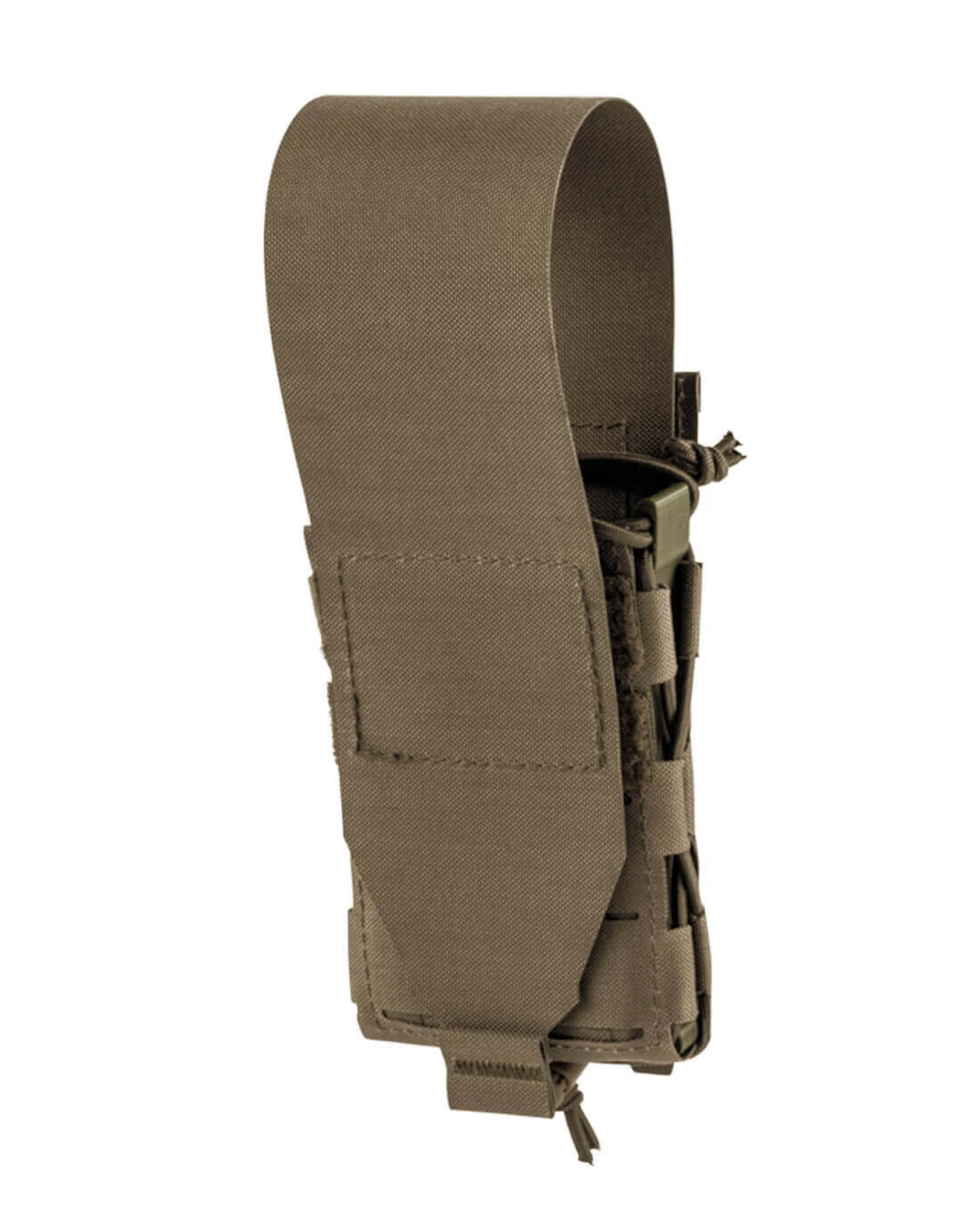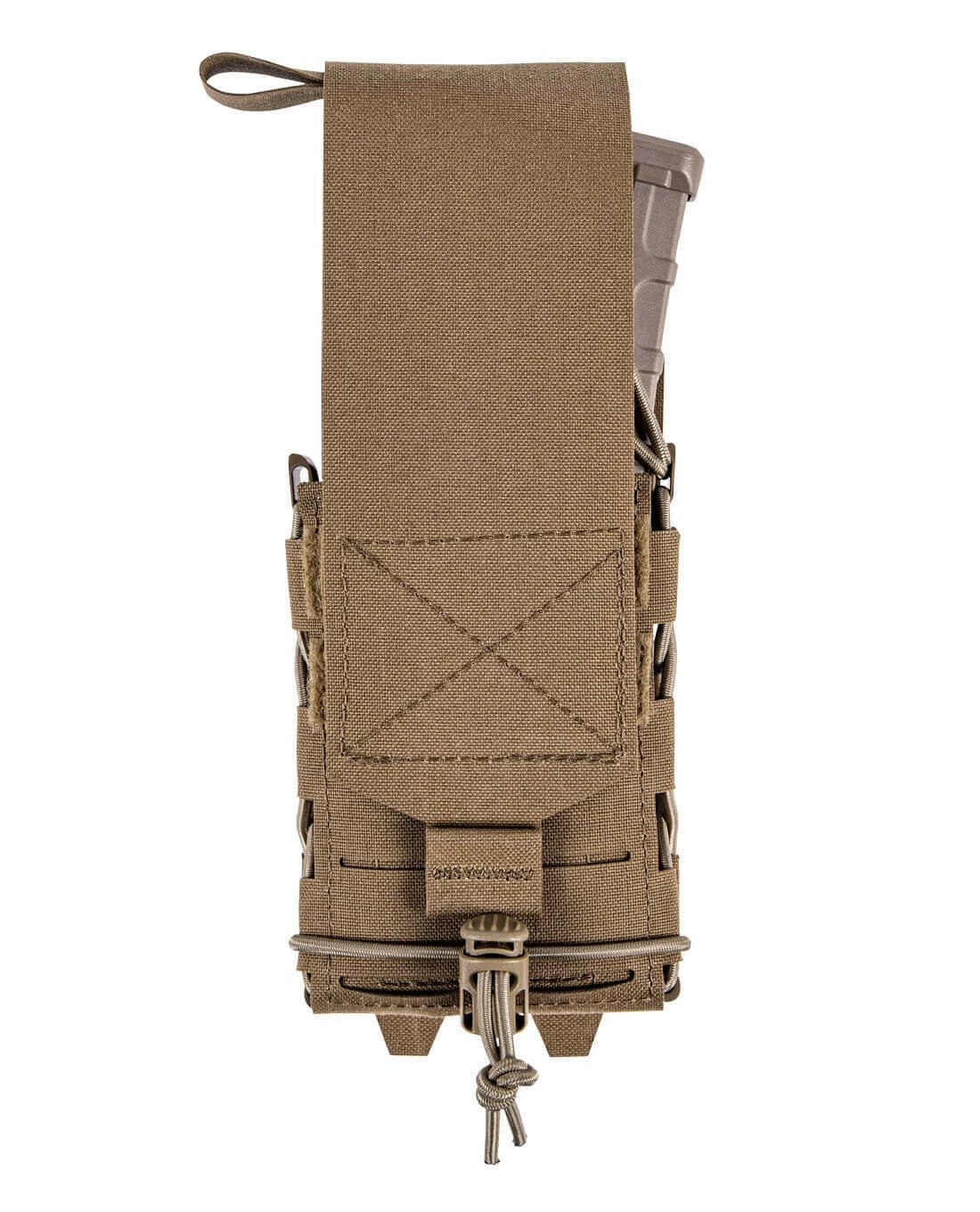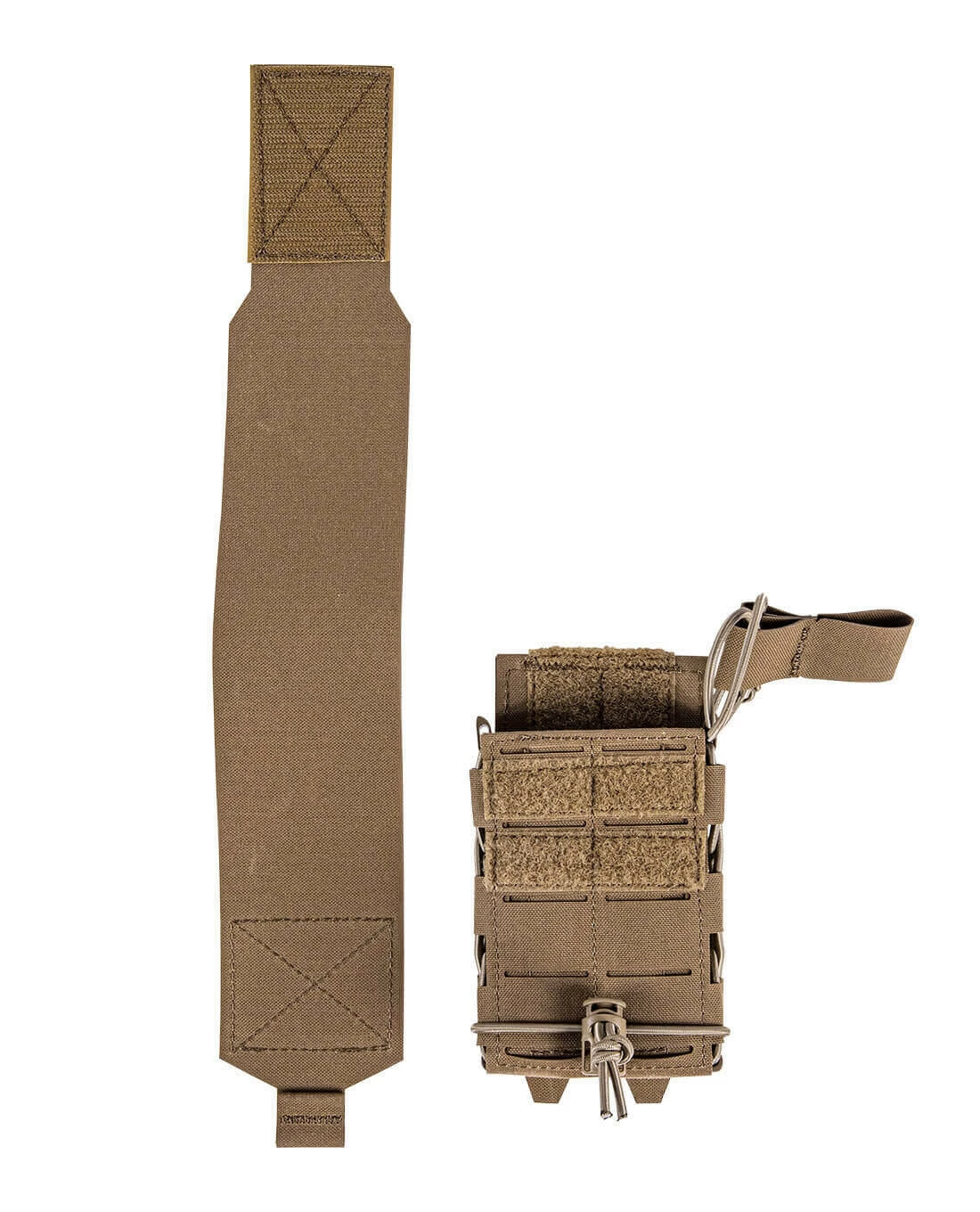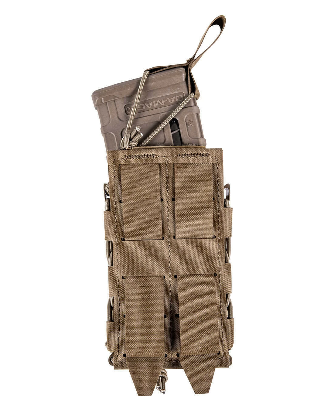Ein höhenverstellbarer, abnehmbarer Deckel ermöglicht dem Nutzer die Multikaliber Schnellziehtasche an verschiedene Magazintypen anzupassen. Um Situationsabhängig die Kompression auf das Magazin zu regulieren, besitzt die Tasche ein umlaufendes, verstellbares Shockcord. Nach Entnahme des Magazins klappt das diagonal verlaufende Sicherungsband zur Seite und gibt die Öffnung der Schnellziehtasche frei.