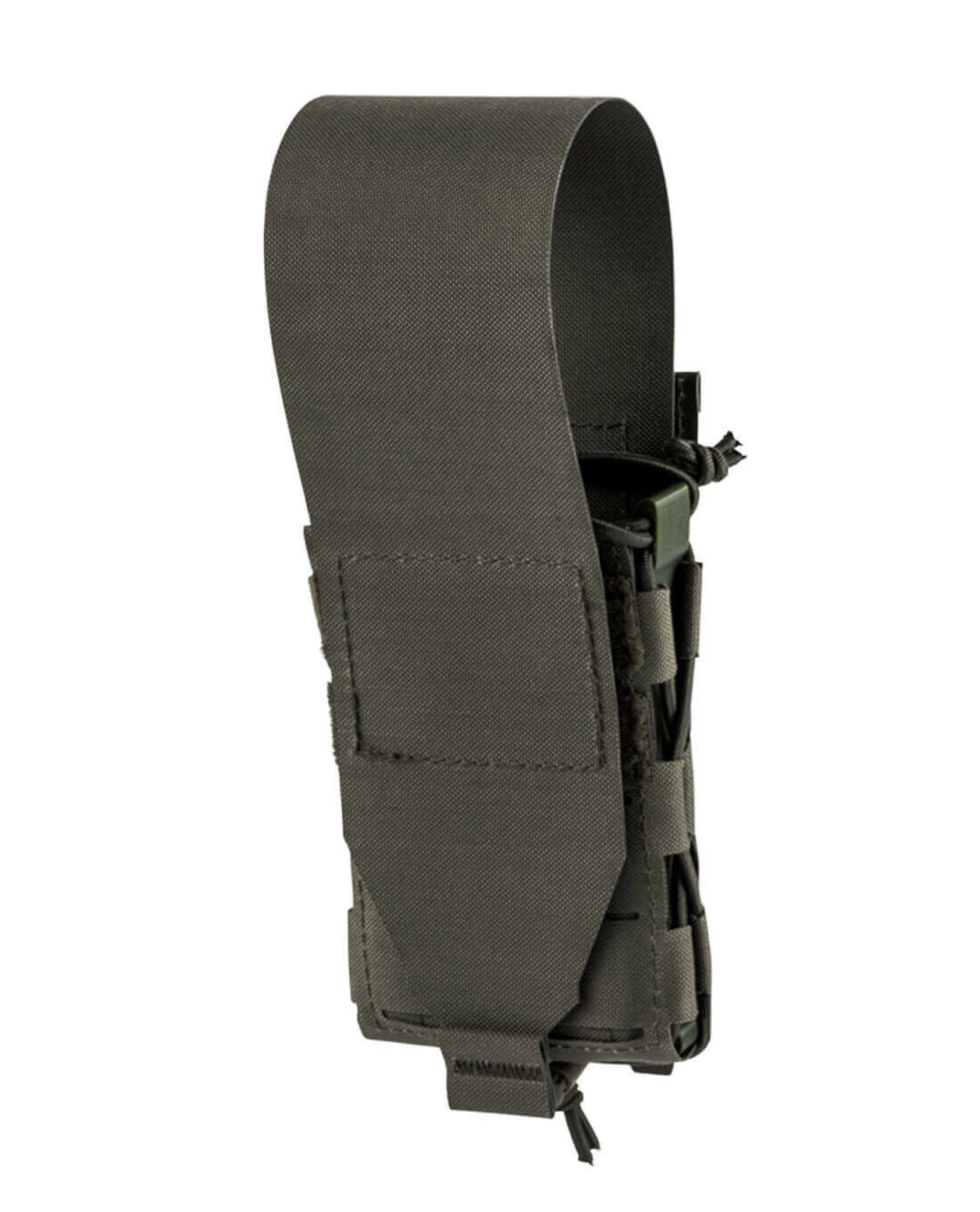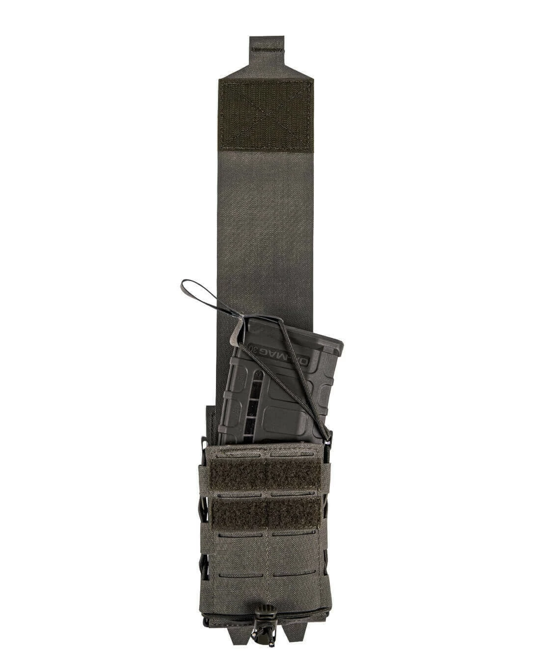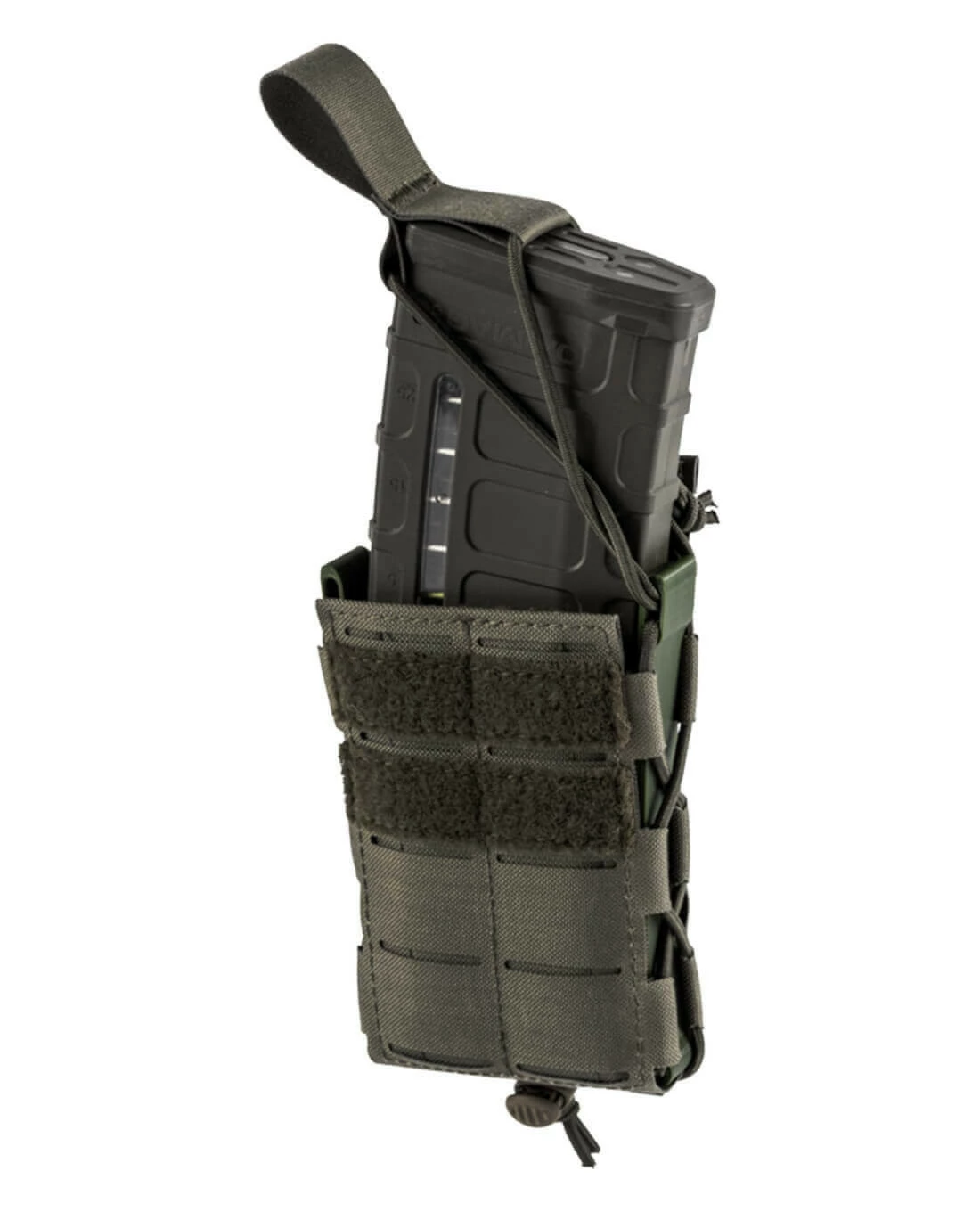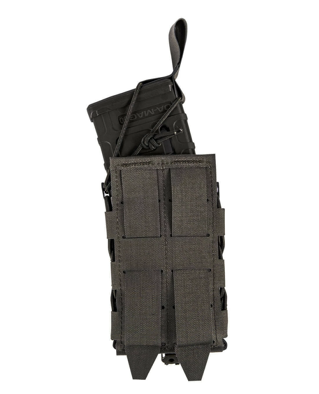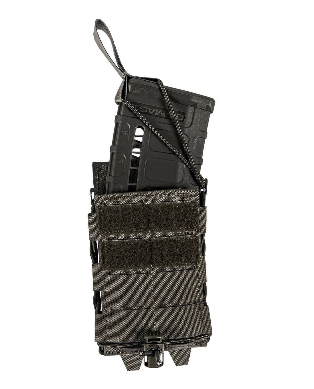 Eine Anpassung an unterschiedliche Magazinformen erfolgt über einen mittels Klett höhenverstellbaren Deckel, der im Bedarfsfall komplett ausklettbar ist. Mittels Shockcord kann die Schnellziehtasche von außen zusätzlich komprimiert werden. Das diagonal angebrachte Sicherungsband klappt nach dem Entfernten des Magazin zur Seite.