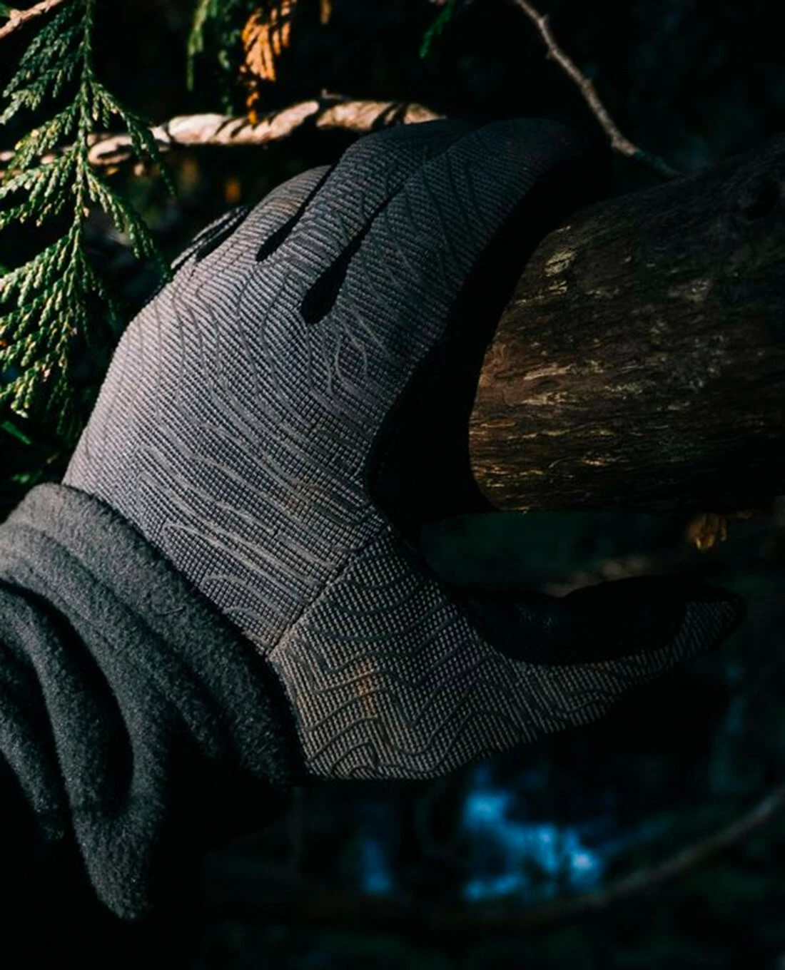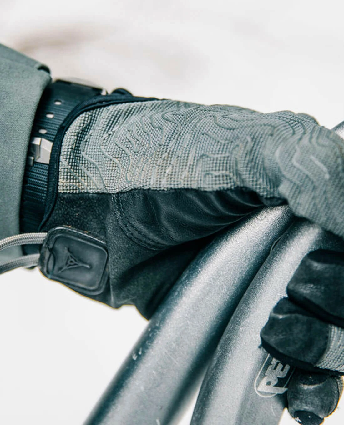 – Handrücken: 2-Wege Stretch Material mit Siebdruck Topo-Grafik
