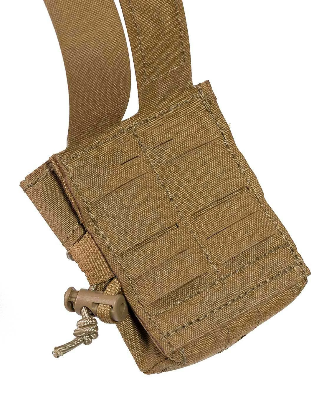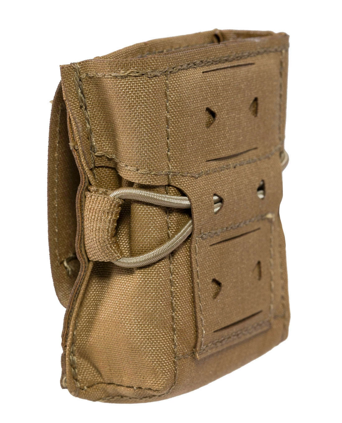 Die Mag Pouch ist für Magazine der Machart M4, AR15, Sig MCX, HK416, und ähnlich große 556 Nato Kaliber Gewehr-Magazine passend, hat natürlich aber auch Platz für Gewehrmagazine ähnlicher Größe. Zusätzlich kann auf der Vorderseite eine Pistolen-Magazintasche befestigt werden; M.O.L.L.E. Schlitze in Lasercut Ausführung sind dafür vorgesehen. das M.O.L.L.E.-System dient auch der Befestigung der Zubehörtasche.