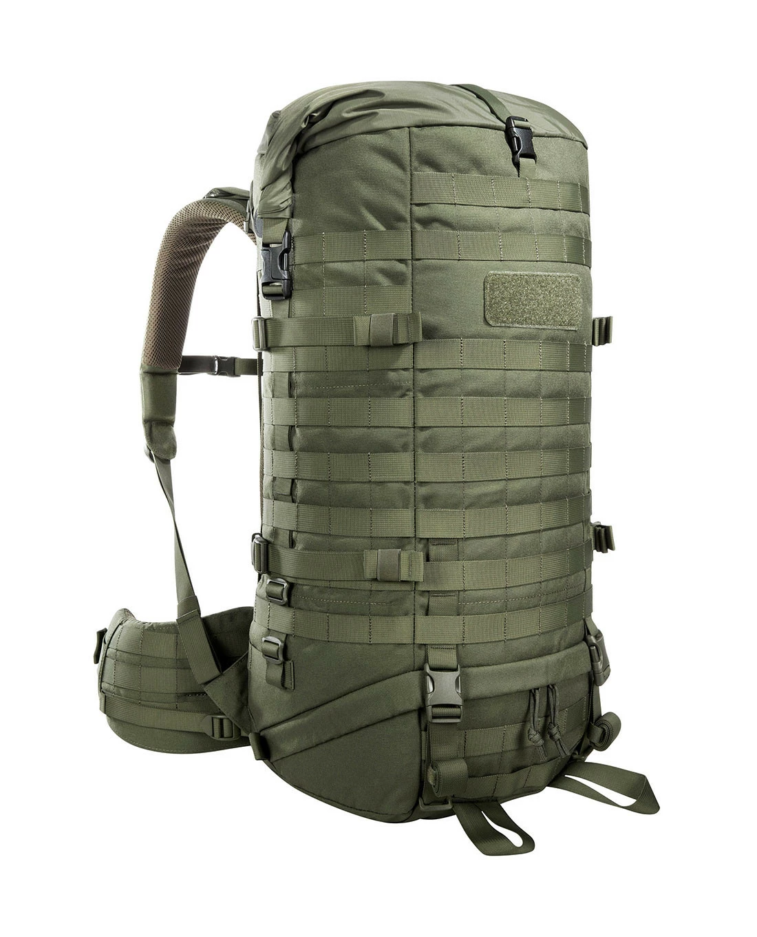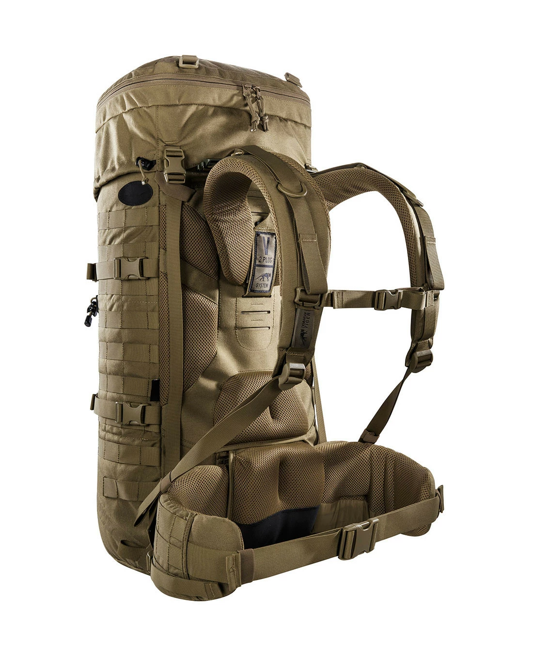 Um den Giganten in voller Beladung stabil und leistungsfähig transportieren zu können, kommt beim Base Pack das Tasmanian Tiger V2 Plus-Tragesystem zum Einsatz, das aufgrund seines hohen Ansatzpunktes eine große Spanne an Einstellungsmöglichkeiten der Rückenlänge hat. Es leitet die Last auf den Hüftgurt ab, der sich aus zwei konisch geschnittenen, gepolsterten Hüftflügeln zusammensetzt. Der Hüftgurt kann abgenommen und dank des umfänglichen MO.L.L.E.System auf der Rückseite als selbständiger Warrior Belt benutzt werden – in dem Fall lässt sich der Base Carrier selbst mit Plattenträger gut transportieren.