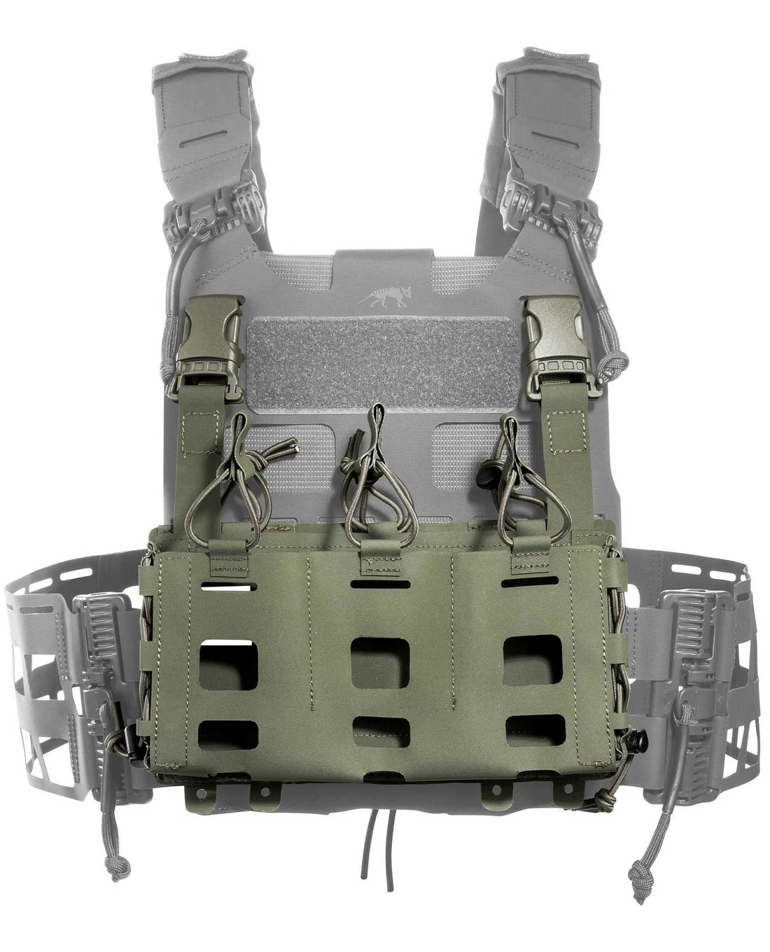 Für die besondere Seewassertauglicheit und Gewichtsersparnis bei Anlandungen ist die setzt Tasmanian Tiger auf eine Kombination von Material und funktioneller Oberflächennutzung: Das Carrier Mag Panel wird aus TPU Cordura 700 den gefertigt, das see- und damit salzwasserbeständig ist. Mit einer Skelettierung der Oberfläche wird für das schnelle Ablaufen von eingetretenem Wasser gesorgt und vollgesogenes, beschwertes Materialvolumen vermieden. Als Nebeneffekt kann die Skelettierung auch der M.O.L.L.E-Befestigung optionaler Magazintaschen dienen. Die Magazine können über das Bungee-Cord zu beiden Seiten in der Tasche fixiert werden.