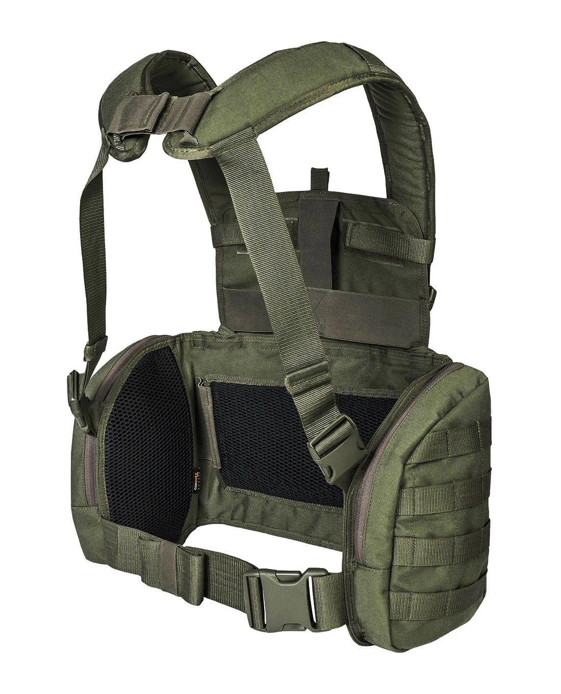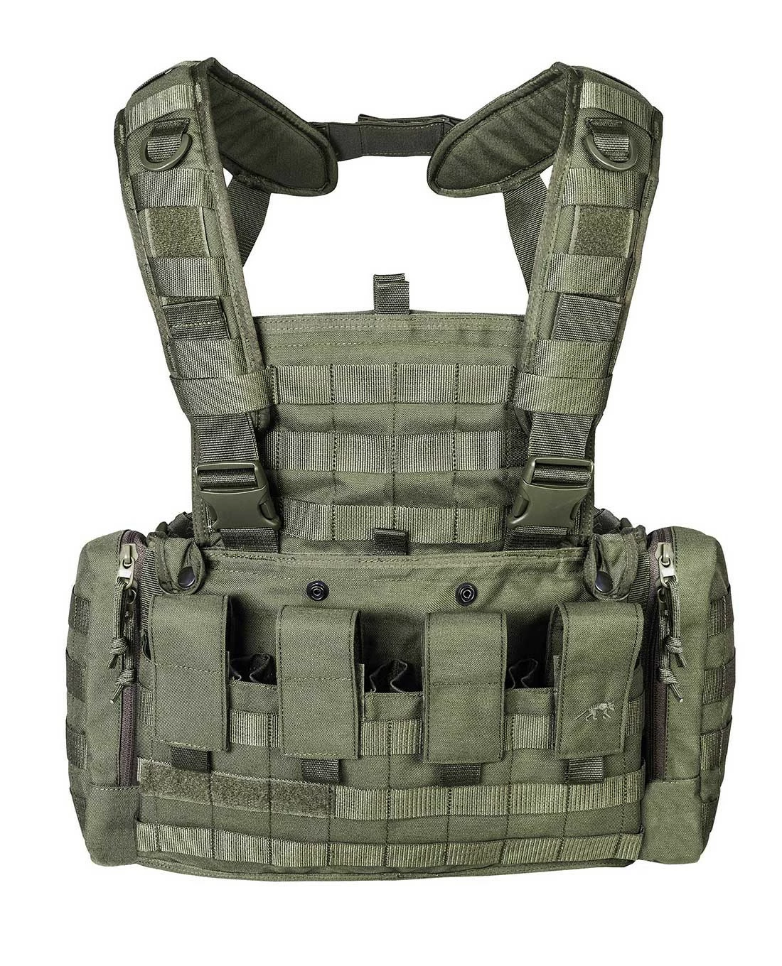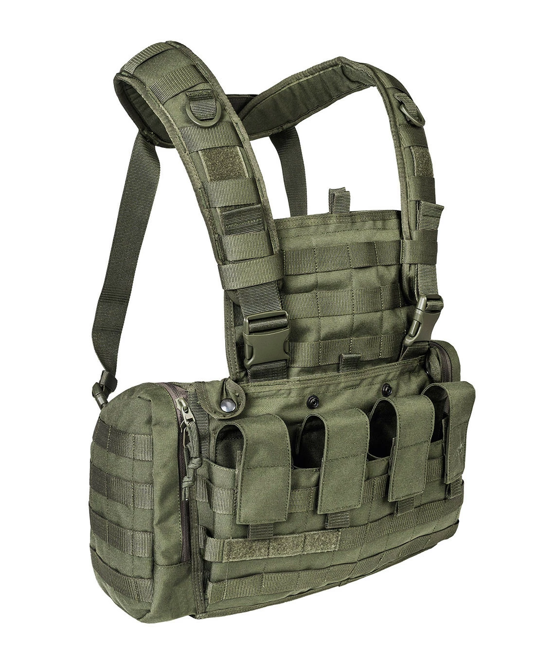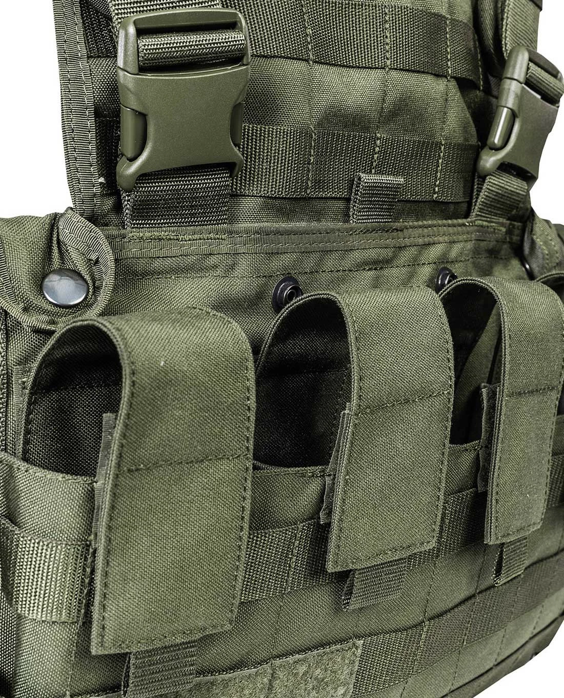 Die Chest Rig ist aus 700Den Cordura gefertigt und mit gut durchdachten Extras ausgestattet: Eine Schutzplatte (nicht im Lieferumfang enthalten) wird in einer Einschubtasche eingeschoben, die ausklappbar ist. Vier Magazintaschen sind auf der Vorderseite angebracht; sie sind geeignet für G36/SIG/AUG oder Mf-M16 Magazine und ersparen das Mitführen externer Magazintaschen. Die Mag Pouches werden natürlich einzeln verschlossen, so dass die Magazine gesichert und einzeln herausgezogen werden können. Die Seitenteile der Kampfmittelweste werden von je einer Mehrzwecktasche ergänzt in der ausreichend Raum für kleinere Ausrüstungsteile ist und die sogar groß genug für eine 1Liter-Wasserflasche ist. Die Seitentaschen werden mit Reißeverschlüssen beziehungsweise einem verstellbaren Klettverschlusssystem verschlossen.