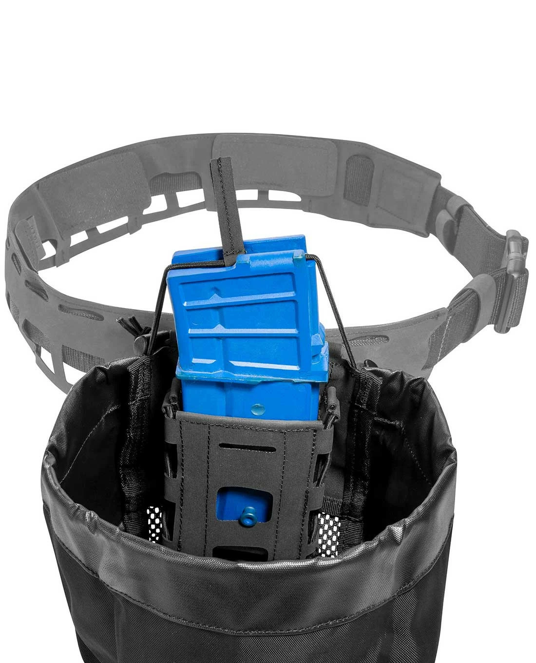 Das 420 HD Nylon FD der Dump Pouch wird durch einen Mesh-Inlay ergänzt, durch den das Wasser schnell ablaufen kann. Weil die Tasche mit einem Kordelzug und Kordelstopper geöffnet und geschlossen wird, kann sie gut einhändig bedient werden. Ist sie gerade nicht im Einsatz, so kann sie klein zusammengefaltet und im Gepäck verstaut werden. Die Pouch bietet als Abwurfsack Raum für 5 x G36 Doppelmagazine und kann im Inneren eine Magazintasche (M4, G36 etc.) oder zwei Pistolenmagazintaschen aufnehmen.