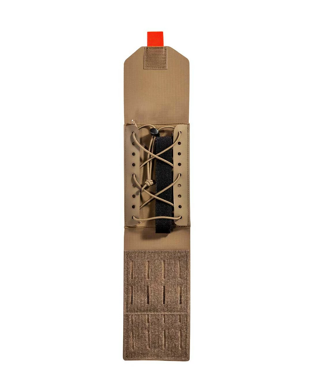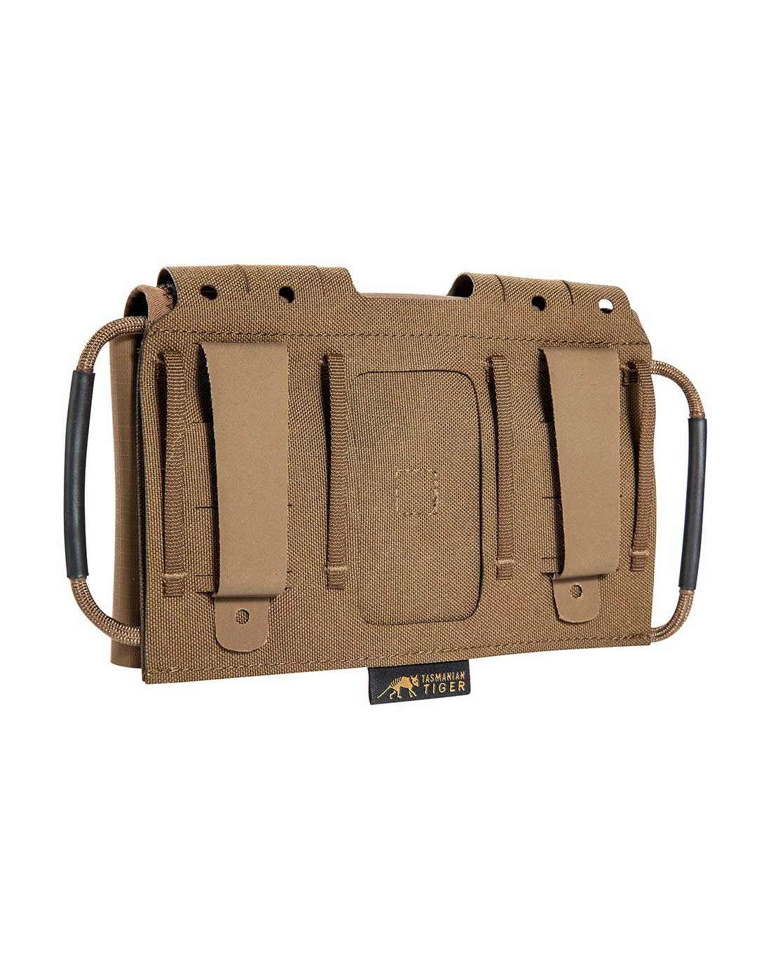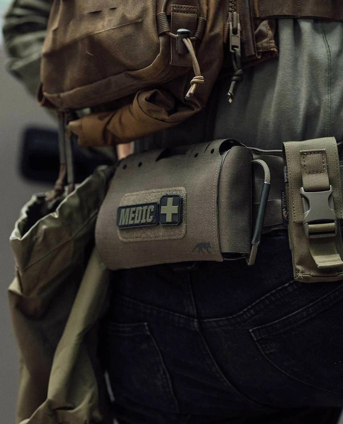 Die kleine Erst-Hilfe-Pouch aus einem laminierten Cordura 500 den beinhaltet ein Panel, das auf beiden Seiten individuell mit medizinischem Ersthilfe-Equipment bestückt werden kann. Das Panel wird im Inneren mit Kordel und Stopper befestigt, so dass es nicht einfach herausrutschen kann. Schnell zugänglich ist es dennoch: Das bestückte Medic-Panel kann auf beiden Seiten herausgezogen werden, ist aber auch durch das Lösen des Klettverschlusses und einfache Öffnen der Deckelklappe zugänglich.