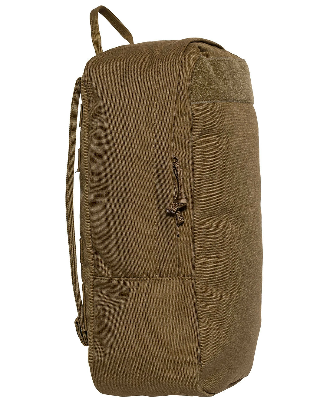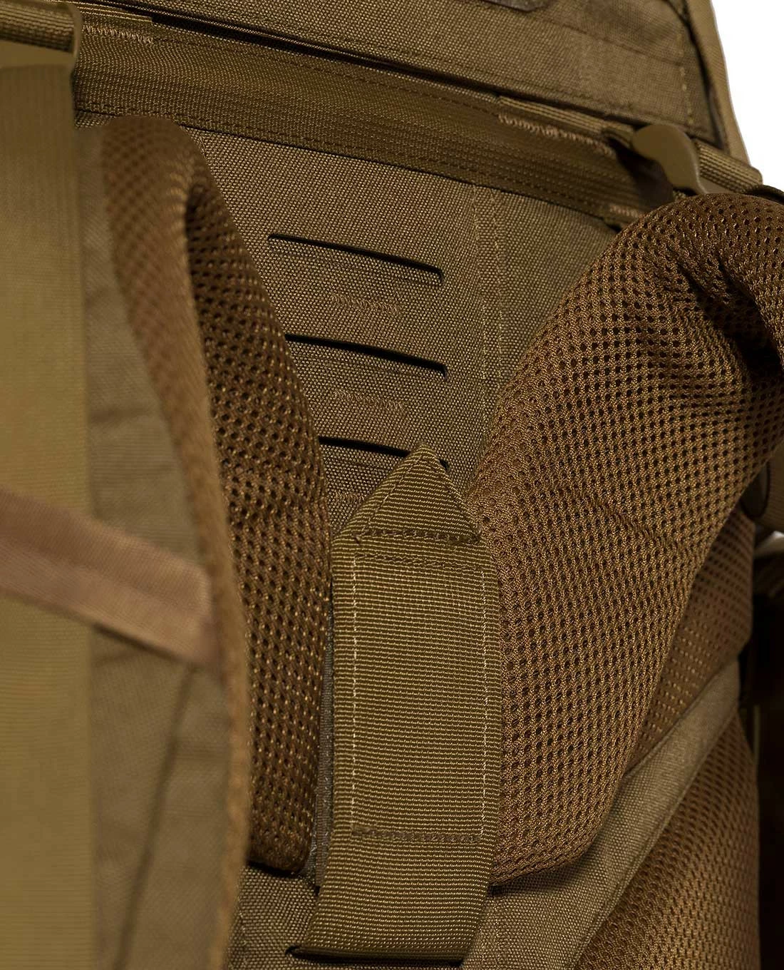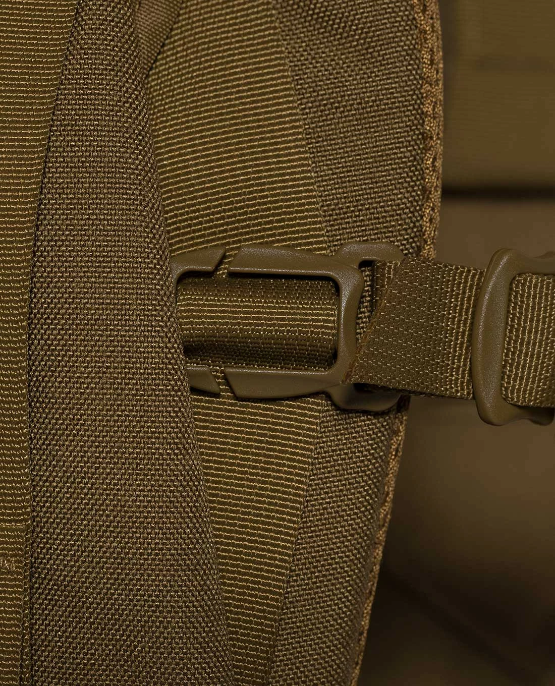 Wird das Gesamtvolumen einmal nicht erreicht, kann der Rucksack mit den seitlichen Kompressionsriemen zusammengezurrt werden. Auch am Boden des Kampfrucksacks verlaufen Kompressionsriemen, die zur Befestigung weiterer Ausrüstung wie zum Beispiel eines Schlafsacks dienlich sind. Schlaufen für Eisgeräte oder Stöcke und selbstverständlich das M.O.L.L.E.-System bringen die typische Individualisierbarkeit des taktischen Einsatzrucksacks ins Spiel.