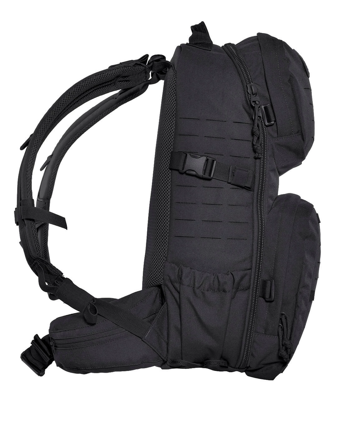 Die gleiche Aufgabe hat das Schultertragesystem, denn auch die beiden Schultergurte sind anatomisch geformt und gepolstert. Sie können außerdem in der Länge verstellt werden, so dass der Rucksack problemlos auch über einer voll beladenen Combat Weste oder dicker Kleidung getragen werden kann, ohne die Mobilität einzuschränken oder Druckstellen zu erzeugen. Gerade bei einer schweren Beladung des Rucksacks können die gepolsterten Hüftflossen dazu dienen, das Gewicht abzuleiten und von den Schultern weg auf die Hüften zu übertragen. Wer den Hüftgurt nicht braucht oder wo er in Kombination mit einem Gürtel oder einer Weste stört, kann er einfach abgenommen werden. Wird er benutzt, ist das M.O.L.L.E. System auf der Oberfläche sowie die beiden Reißverschlusstaschen jedoch durchaus sinnvoll zu verwenden.