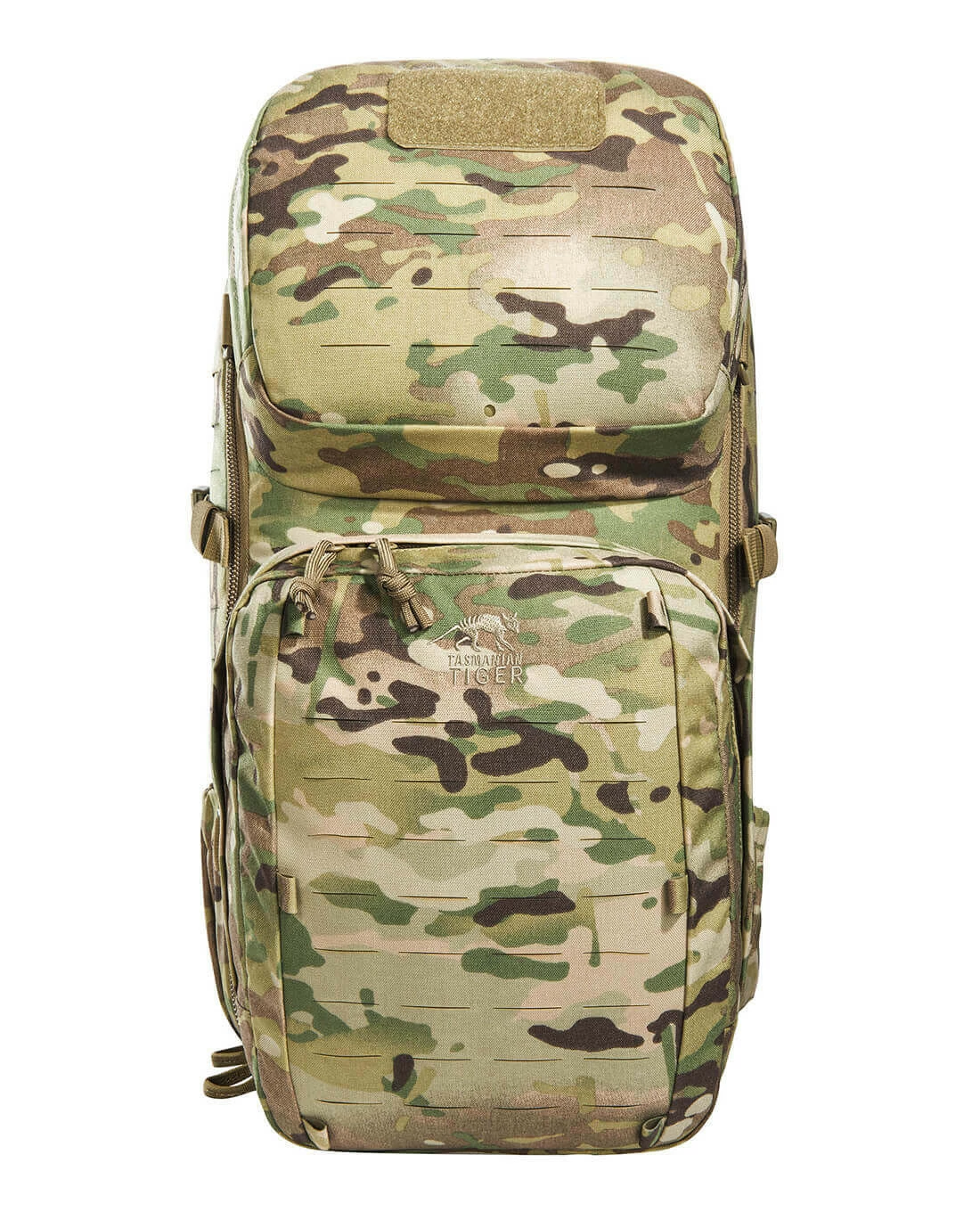 Auf der Front des Rucksacks aufgesetzt sind nun zwei weitere Taschen; die obere mit einem Fassungsvermögen von 2 Litern, die untere mit einem Volumen von 3 Litern. Beide Taschen werden mit einem Reißverschluss geschlossen und beide haben das M.O.L.L.E.-System in Lasercut-Ausführung auf ihrer Oberseite. Damit ist der Rucksack nahezu rundherum mit M.O.L.L.E. System, ausgestattet und kann dementsprechend verschwenderisch mit weiteren Taschen bestückt werden.