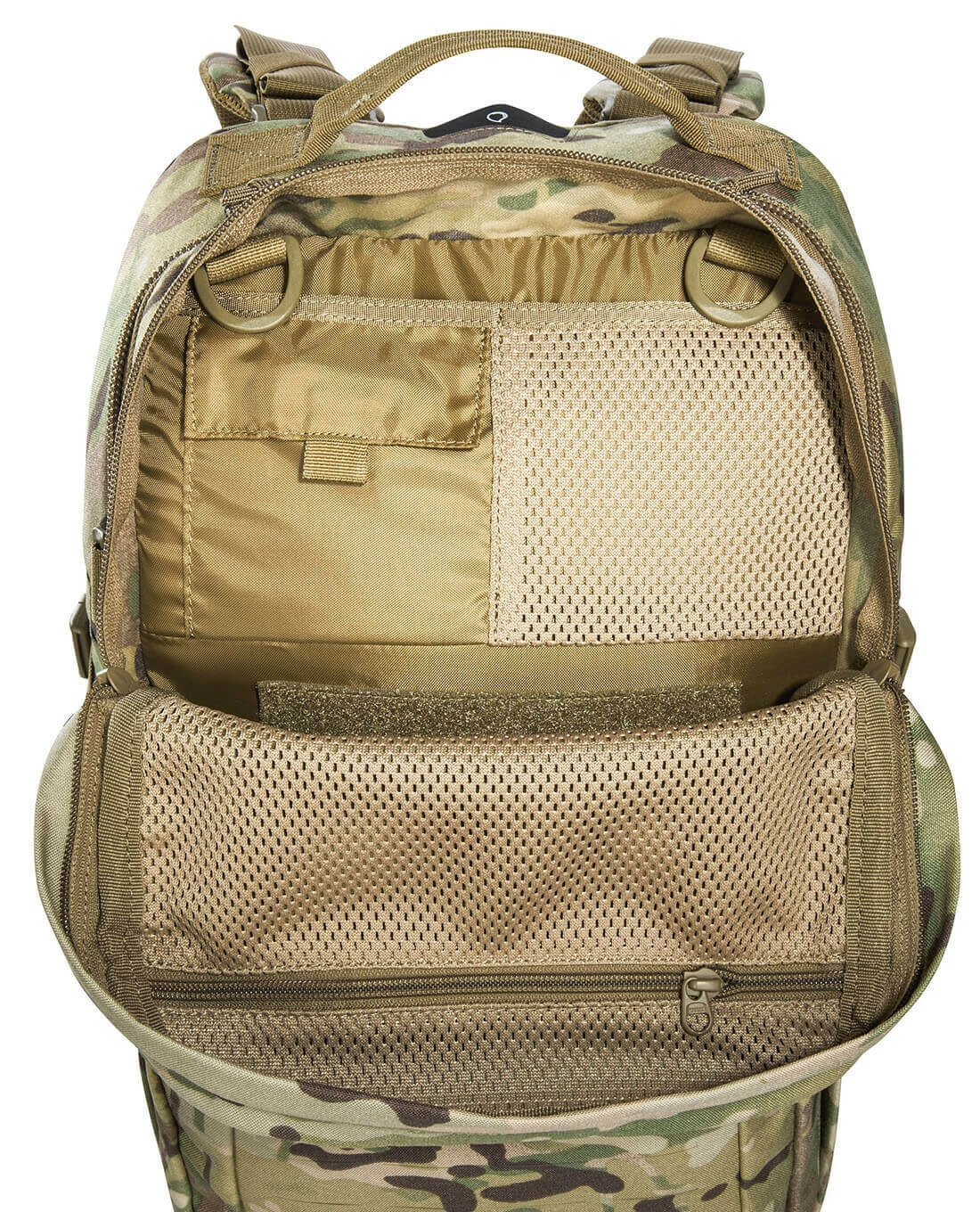 Und bei all den großen und kleinen Fächern lohnt eine volle Ausnutzung der Kapazitäten. Das Hauptfach fasst 17 Volumen und kann mit einem Reißverschluss rundherum geöffnet werden, was bedeutet, dass der Tagesrucksack wie ein Frontlader behandelt und im Prinzip wie ein Koffer gepackt werden kann. Im Inneren ist eine kleine Netztaschen integriert, in der die üblichen Kleinteile verstaut werden können, die ansonsten lose herumfliegen, sprich: Batterien, Kopfhörer, Schlüssel. Ein M.O.L.L.E.-Klett im Inneren ist ein Beitrag zur Modularität: Zubehör-Pouches, Magazintaschen oder andere Kleinteile können hier schnell befestigt werden. Natürlich gibt es auch eine Trinksystemvorbereitung, ein Feature das gerade im taktischen Bereich nicht mehr fehlen darf.
