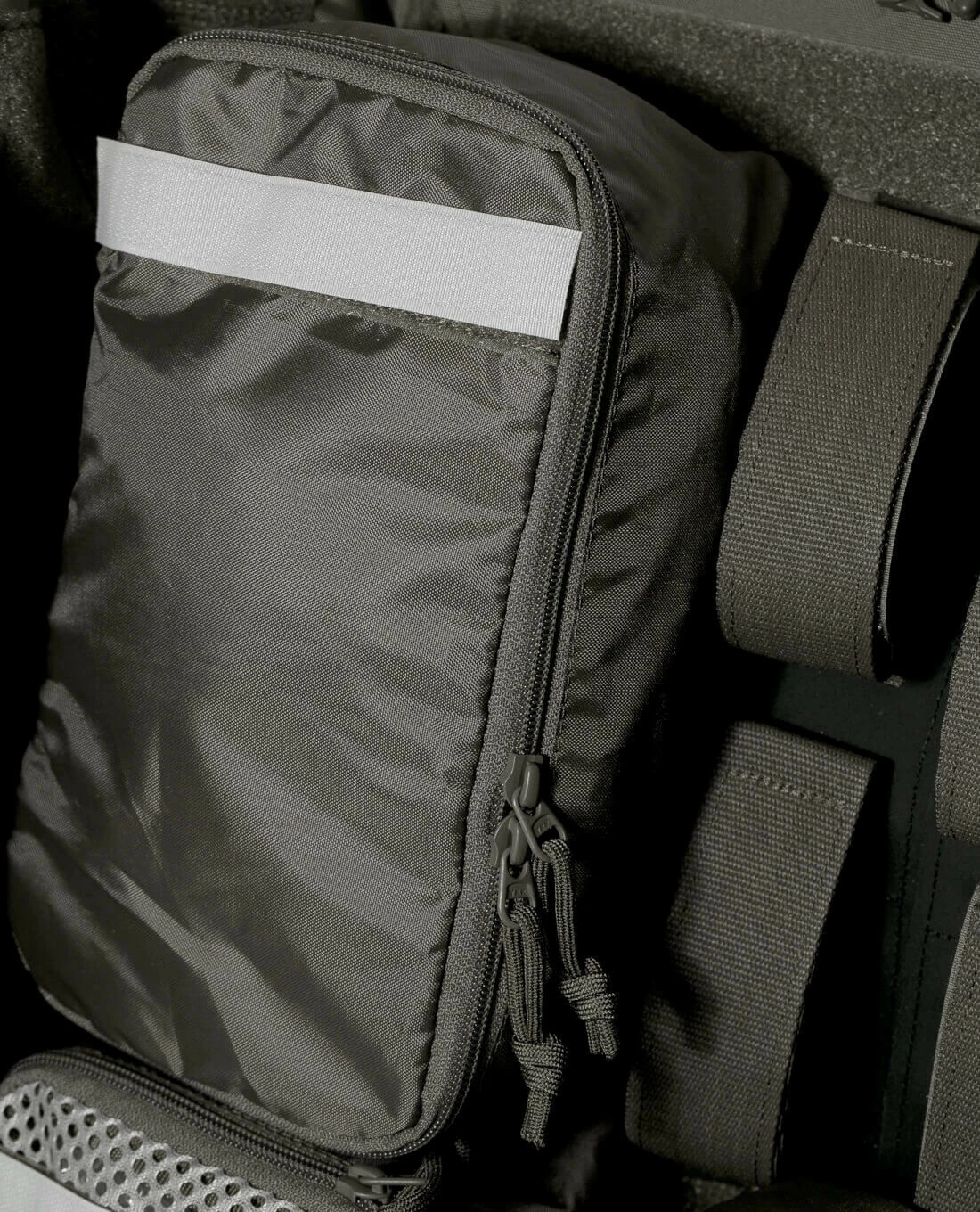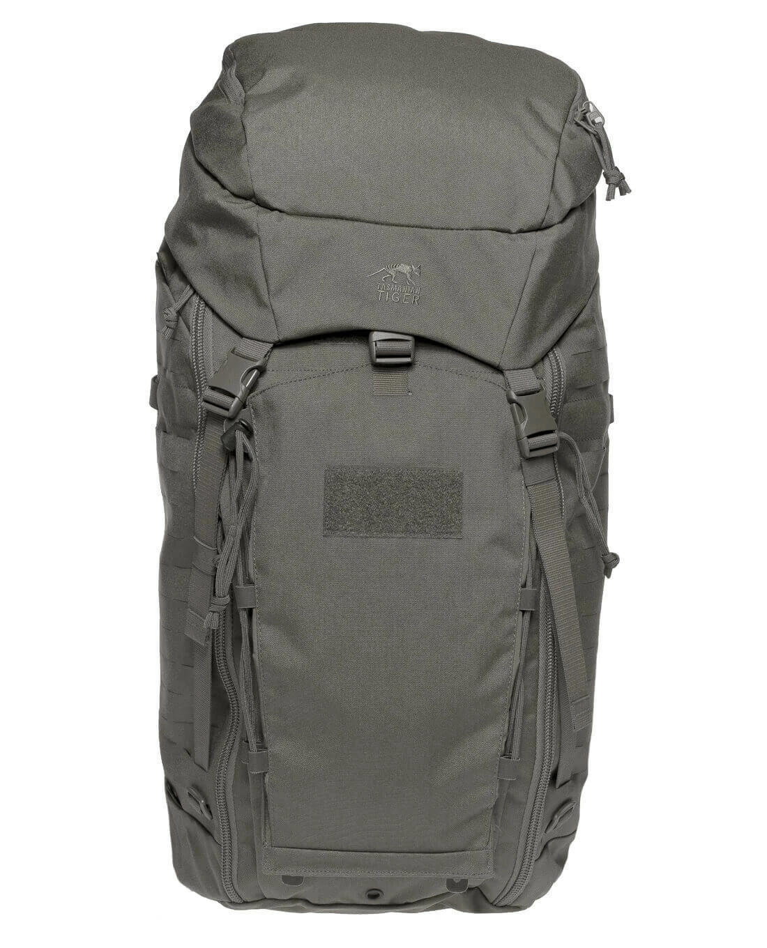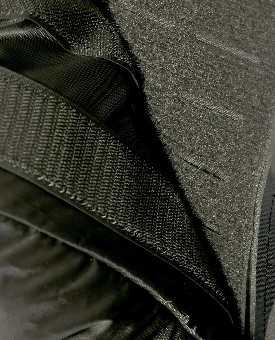 Auf der Vorderseite befindet sich eine Falttasche (Beavertail), die am Laser Cut eingeschlauft ist und von der Hardshell Jacke über den ballistischen Helm alles aufnimmt. Dank des robusten Survival Cords lässt sich die Größe variabel anpassen und die Ladung zuverlässig sichern. Unter dem Beavertail befindet eine Einschubtasche, die jederzeit zugänglich ist. Eine Flauschklettfläche für ID oder Morale Patches befindet sich sowohl auf dem Beavertail als auch direkt auf dem Modular Pack 45 Plus IRR. Dank der umlaufenden Laser Cut Schlaufen gibt es eine Vielzahl an Individualisierungsmöglichkeiten mittels M.O.L.L.E. kompatiblen Taschen und Tasmanian Tiger Tac Pouches.