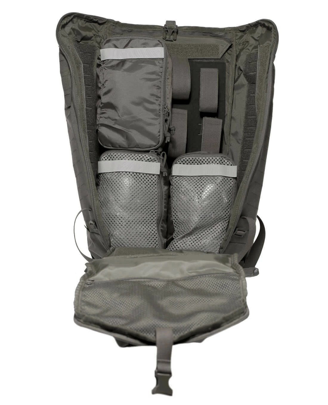 TT typisch ist das Hauptfach für ein Trinksystem vorbereitet. Der Trinkschlauch kann durch einen der verstärkten Antennendurchlässe herausgeführt werden. Über dem Trinkblasenhalter befindet sich ein weiterer Eingriff in das Hauptfach, der entweder den schnellen Griff in den Modular Pack 45 Plus IRR oder den Transport einer Langwaffe möglich macht.