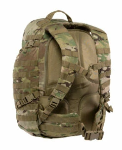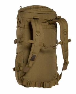 Selbst der Deckel des Hauptfachs ist innen mit Flauschklett versehen und verfügt über eine große Mechpocket mit Zipper zum Verstauen kleinerer Utensilien. Der Rucksack kann für jeden Einsatz optimal konfiguriert werden. Bei Teilbefüllung, kann das Hauptfach mittels Gurtband komprimiert werden. Eine Trinkblase kann im Hauptfach mittels Klettschlaufe fixiert oder alternativ im Fach des Tragesystems sicher verstaut werden. Der Trinkschlauch kann problemlos rechts oder links durch einen der Antennendurchlässe herausgeführt werden. Über dem Trinkblasenhalter befindet sich ein weiterer Eingriff in das Hauptfach, der entweder den schnellen Griff in den Rucksack oder den Transport einer Langwaffe ermöglicht.