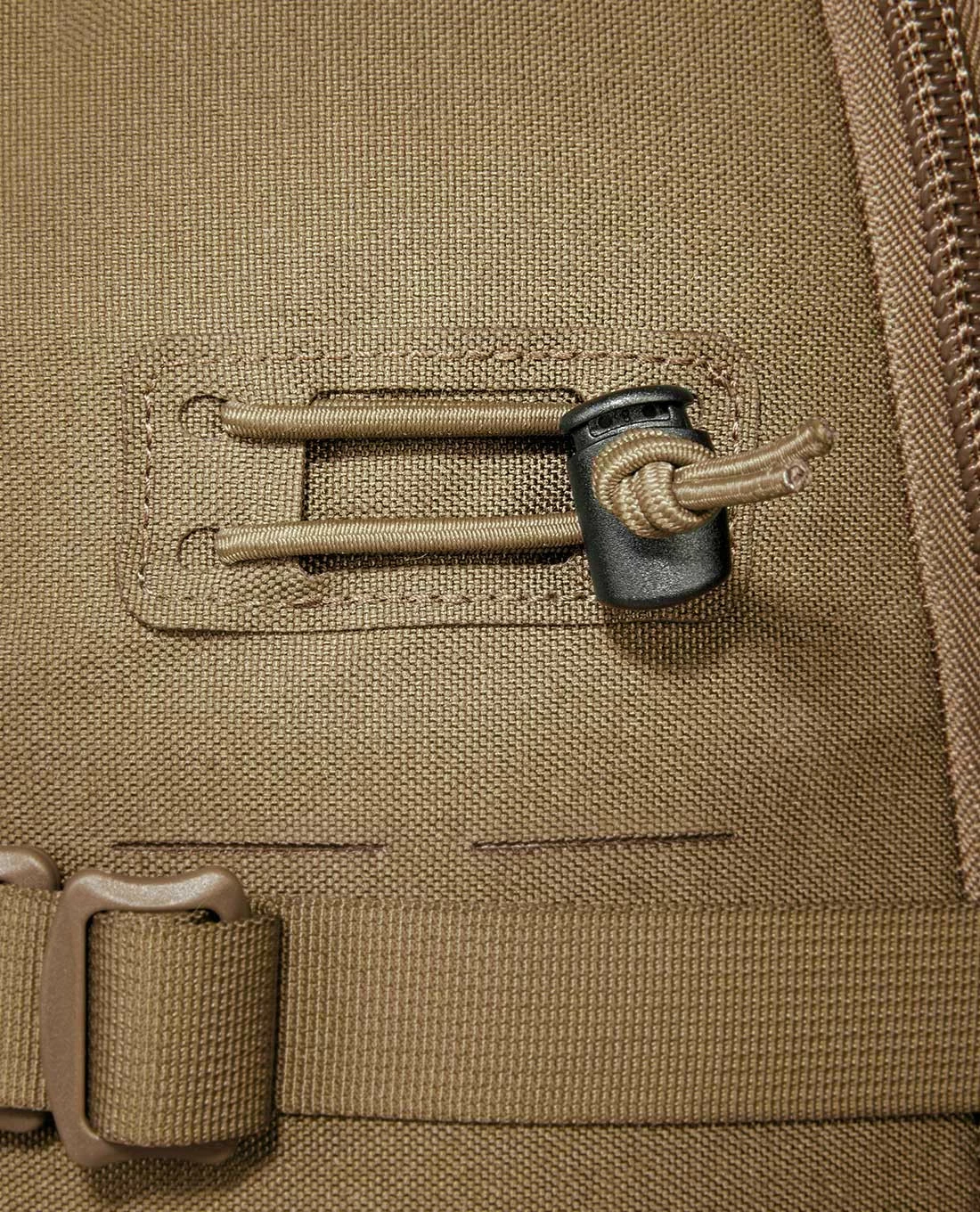 Die Vorderseite des Tagesrucksacks ist mit einer flachen Reißverschlusstasche besetzt, die von außen schnell erreichbar ist. Auf der Front sind außerdem Lasercut-M.O.L.L.E und eine Klettfläche angebracht, die das gewohnt modulare Setup mit M.O.L.L.E Systemen individuell erweiterbar macht. Für Stative oder Wanderstöcke sind an den Seiten Bungee Cords zur Befestigung angebracht, außerdem kann über die beiden vertikal verlaufenden Kompressionsriemen das Volumen komprimiert werden und der Rucksack damit kompakt zusammengehalten werden.