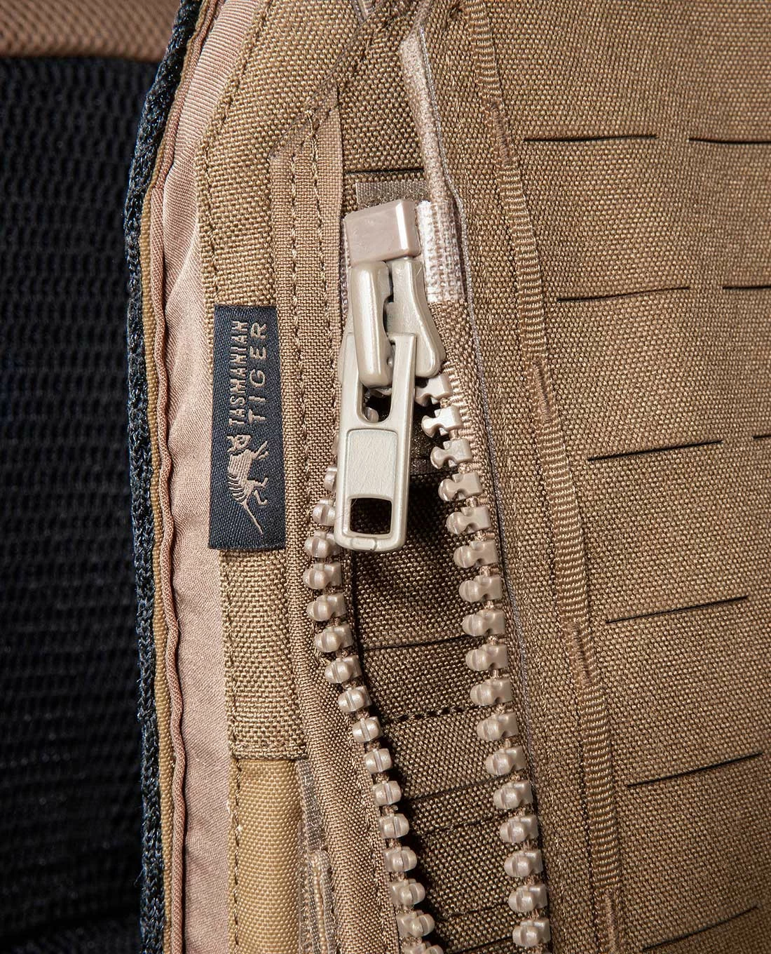 Auf der Rückseite können die Zubehörteile der ZP Serie an zwei Reißverschlüssen befestigt werden. Als Grund-Setup wird die ballistische Schutzweste mit M.O.L.L.E Panel geliefert, es passen aber auch die restlichen Teile der Serie wie zum Beispiel der TT Tool Pack ZP und die TT Medic Assault Pack S ZP.