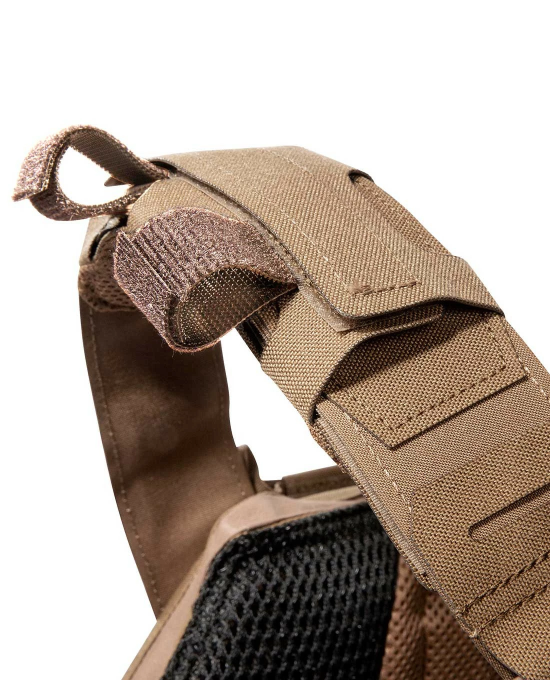 Der Plattenträger, gemacht für SAPI Platten mit den Maßen 25 x 30 cm bis maximal 26 x 33 cm, ist dank seines widerstandsfähigen Cordura 700 den für volle Beladung und anspruchsvolle Einsätze aufgestellt. Auf der Vorderseite ist der Träger mit M.O.L.L.E-System in Lasercut-Ausführung bestückt, das von Klettflausch-Streifen ergänzt wird. Eine modulare Ergänzung von Pouches und Gear ist hier also wie gewohnt gewöhnlich.