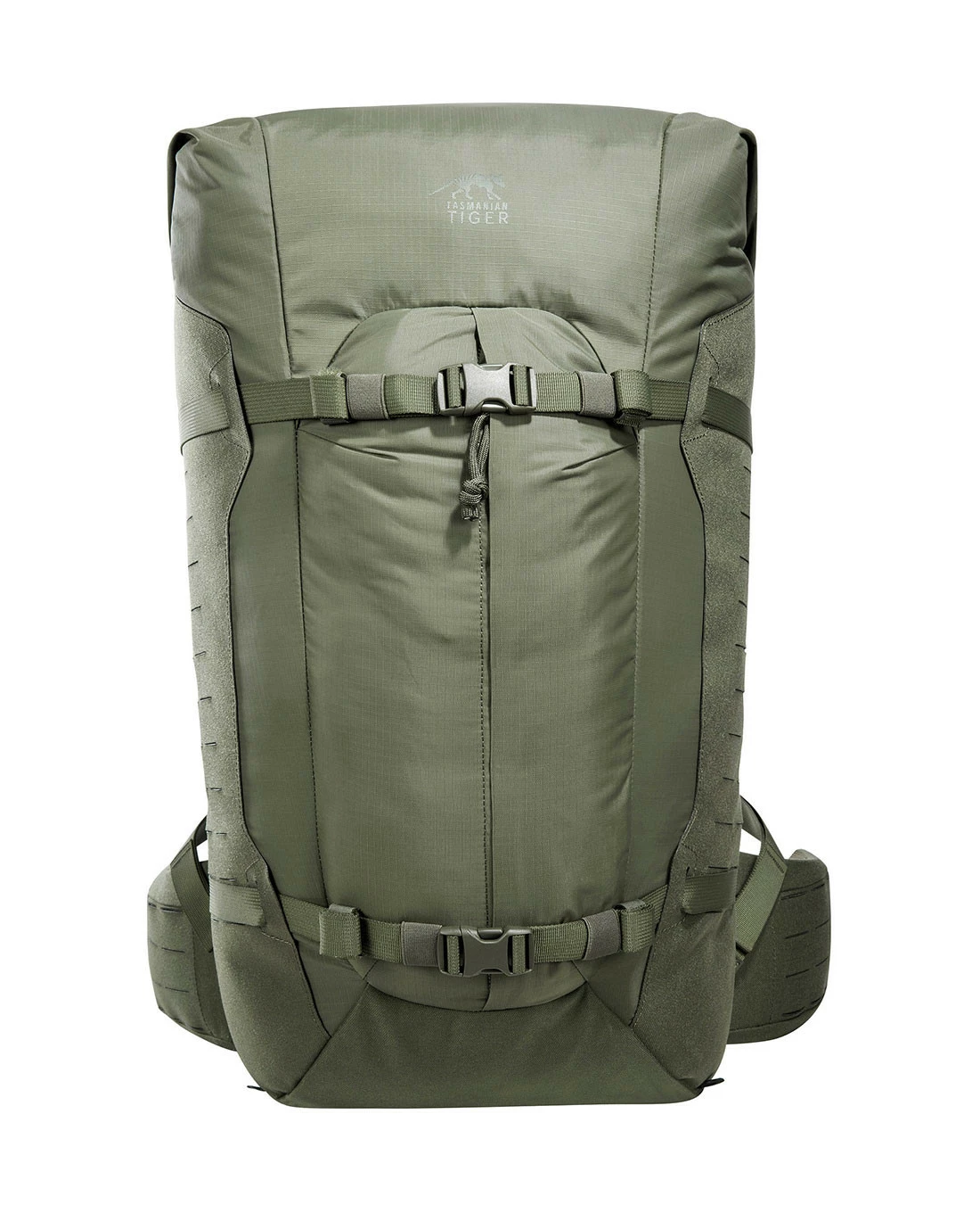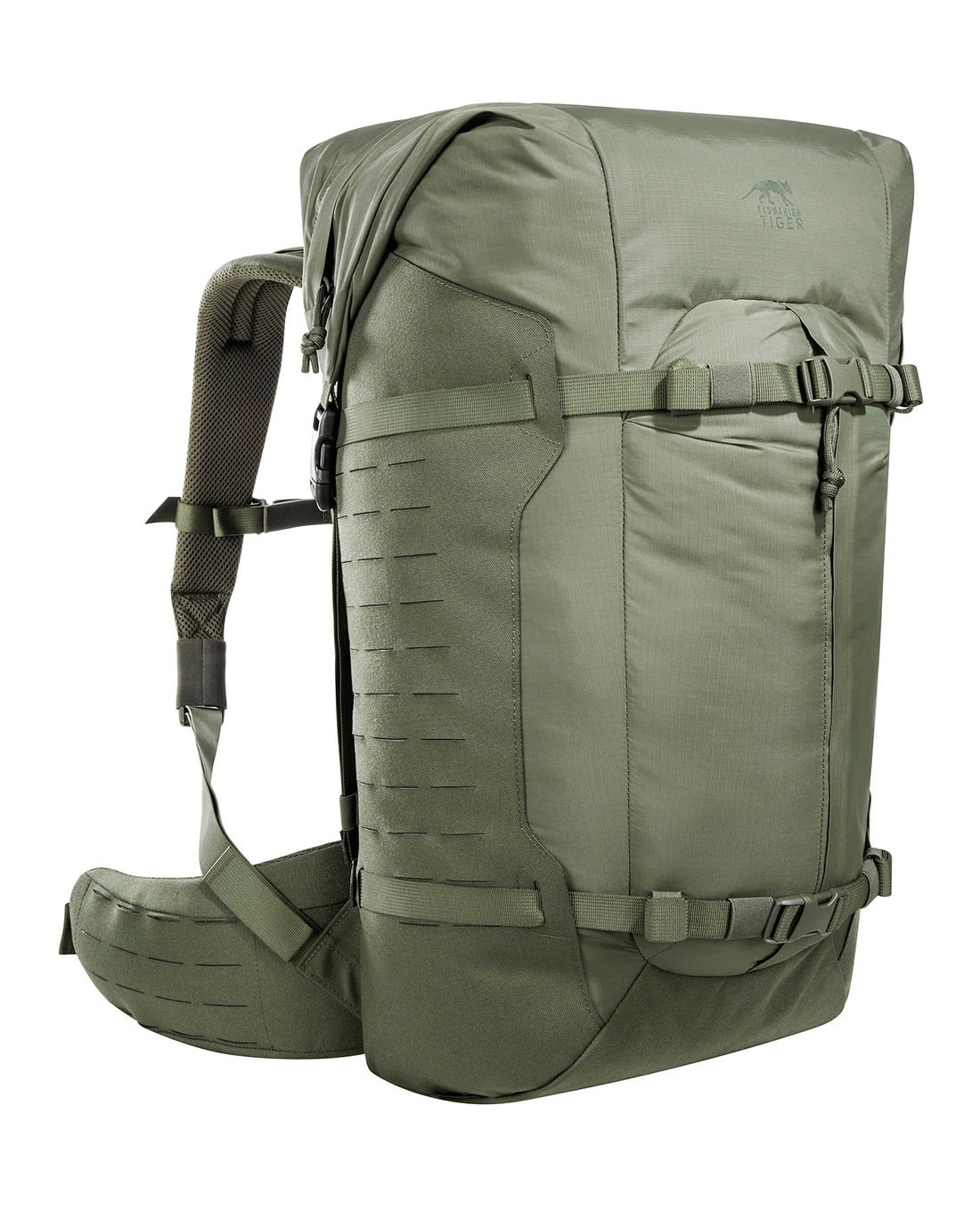 Obwohl das Cordura 700 den in T-Square Rip FD Verarbeitung mitnichten an Robustheit und Langlebigkeit einspart, ist der verhältnismäßig leichte Rucksack auch im Look zurückhaltend und neutral. Auf umlaufendende oder aufgesetzte M.O.L.L.E Schlaufen wurde etwa verzichtet und statt dessen an den Seiten das M.O.L.L.E-System in Lasercut-Ausführung angebracht, das wesentlich weniger Materialaufkommen verzeichnet. Das Hauptfach des Rucksacks wird über einen Roll-Top-Verschluss erreicht, der mit einem Reißverschluss geschlossen wird und in zwei verschiedenen Positionen geschlossen werden kann.