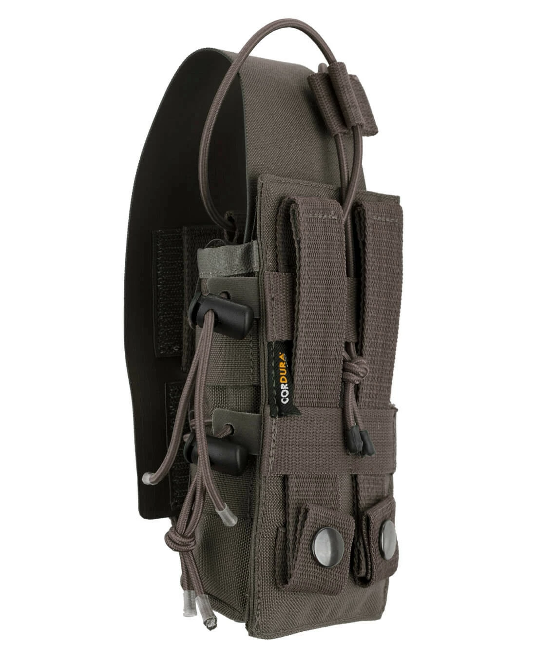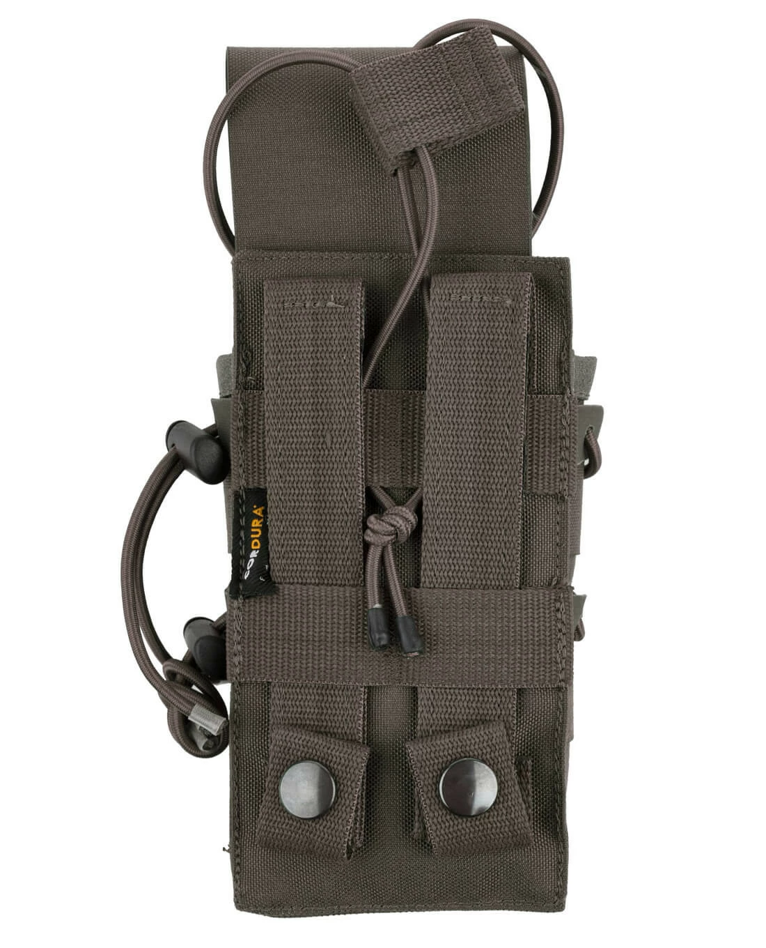 Während das Magazin in der Pouch durch verstellbaren Bungee Cord fixiert wird, sichert es eine abnehmbare Flap aus Laminat zusätzlich gegen Verlust ab. Die Flap kann, sofern benötigt, wahlweise per Klett oder ebenfalls abnehmbarer 25 mm Steckschließe geschlossen werden.