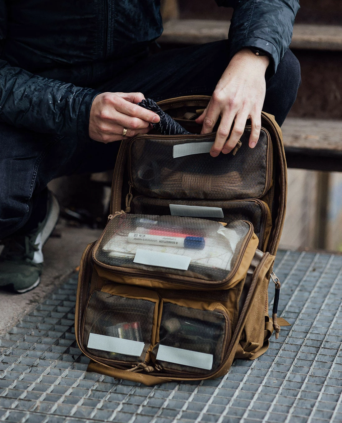Im Bodenfach ist eine zweiseitig verwendbare Regenhülle verstaut, die auf einer Seite mit Streifen in Warn-Orange versehen ist. Außerdem ist ein Tac Marker integriert.