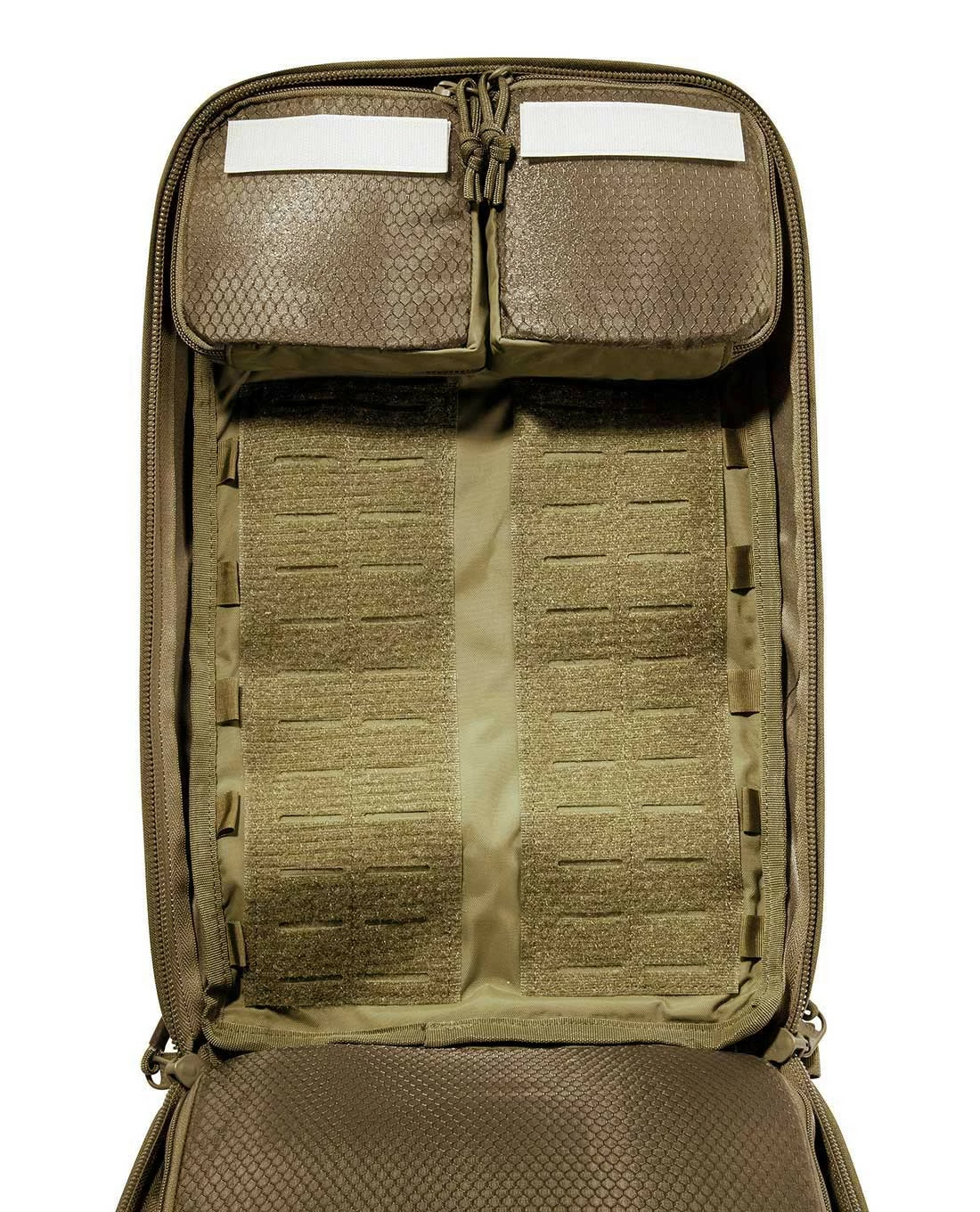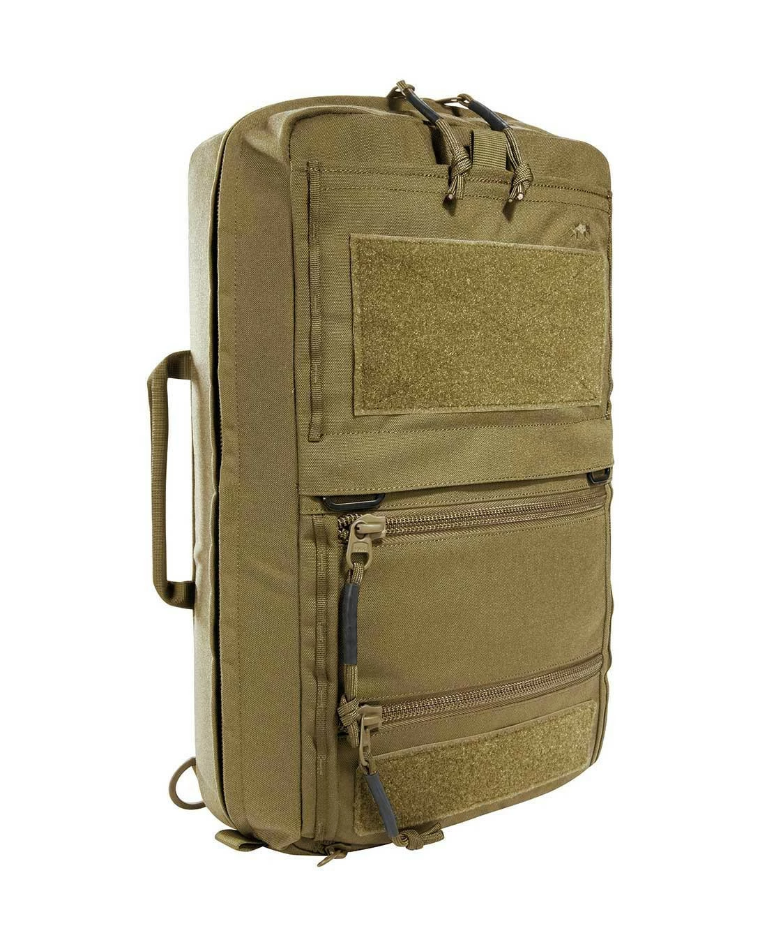 Zwei flache Reißverschlussfächer auf der Front sind außerdem für schnell erreichbare Dokumente und EDC geeignet. Auf der Front können zudem zusätzliche Taschen oder Panels in den beiden vorhandenen Haken eingehängt werden. Die beiden großen Patchflächen sind zur Bestückung mit ID Patches vorhanden, außerdem sind beschriftbare Klettstreifen und eine integrierte Sichtmarkierung enthalten.