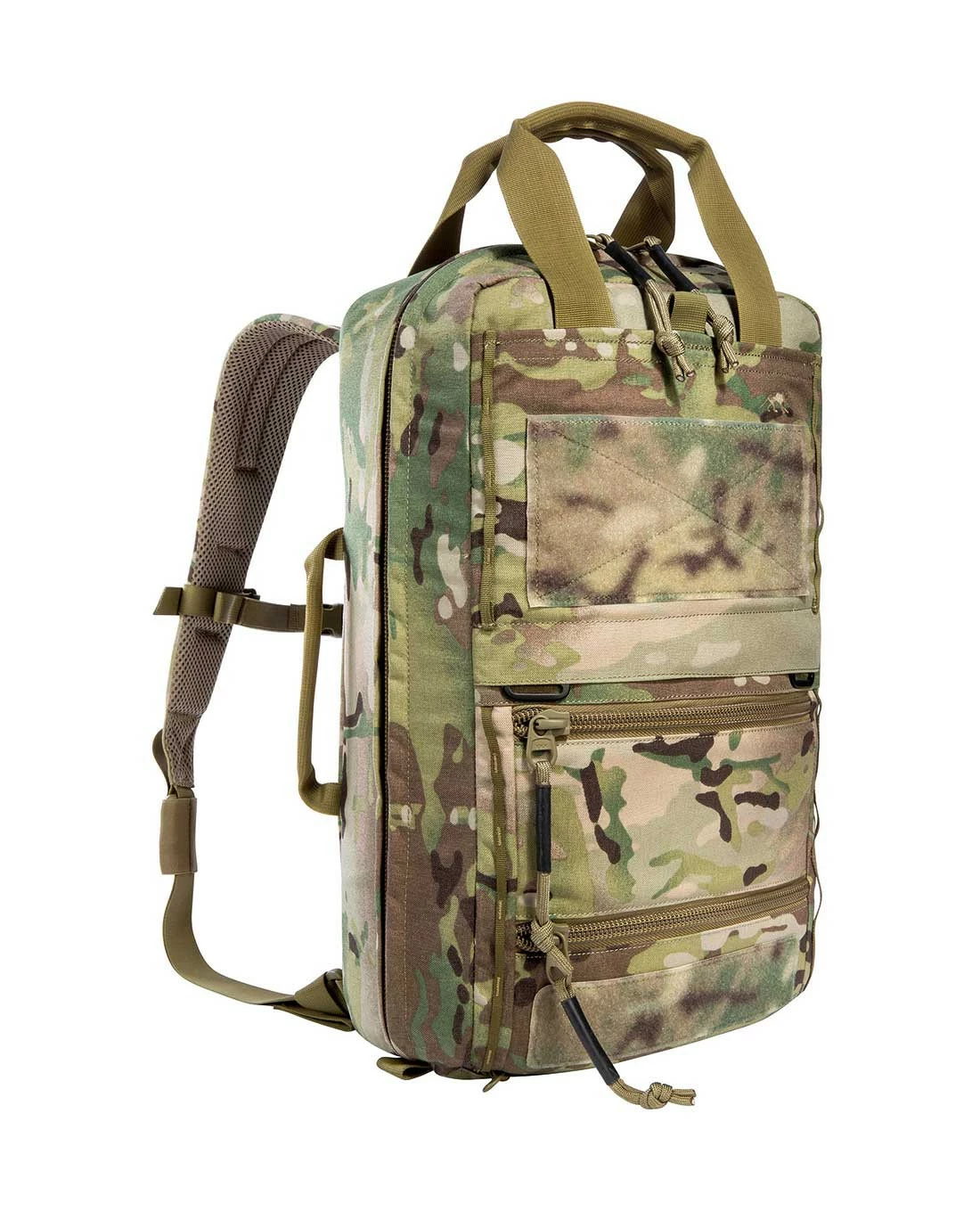 Das TT Survival Pack wird aus robustem Cordura 500 den gefertigt und fügt sich damit in die lange Reihe der getestet und bewährten TT Rucksäcke in Multicam ein. Ein langer Reißverschluss ermöglicht es, das das Hauptfach vollständig aufzuklappen und damit alle Inhalte gut zu erreichen. Im Inneren sind sechs Taschen mit durchsichtigem Deckel angebracht: Hier finden EDC und Medikamente in unterschiedlich großen Taschen zwischen 0,5 Liter und 6 Liter Volumen Platz. Zwei der Taschen können herausgenommen werden.