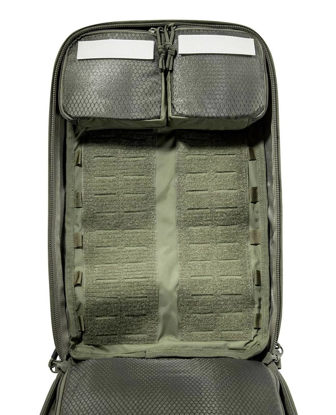 Die Innenseite des Hauptfachs ist außerdem mit einer großzügigen M.O.L.L.E-Klettfläche ausgestattet, damit alle gängigen modularen Komponenten ohne große Umstände befestigt werden können. Auf der Außenseite befinden sich zwei flache Reißverschlussfächer für Dokumente.