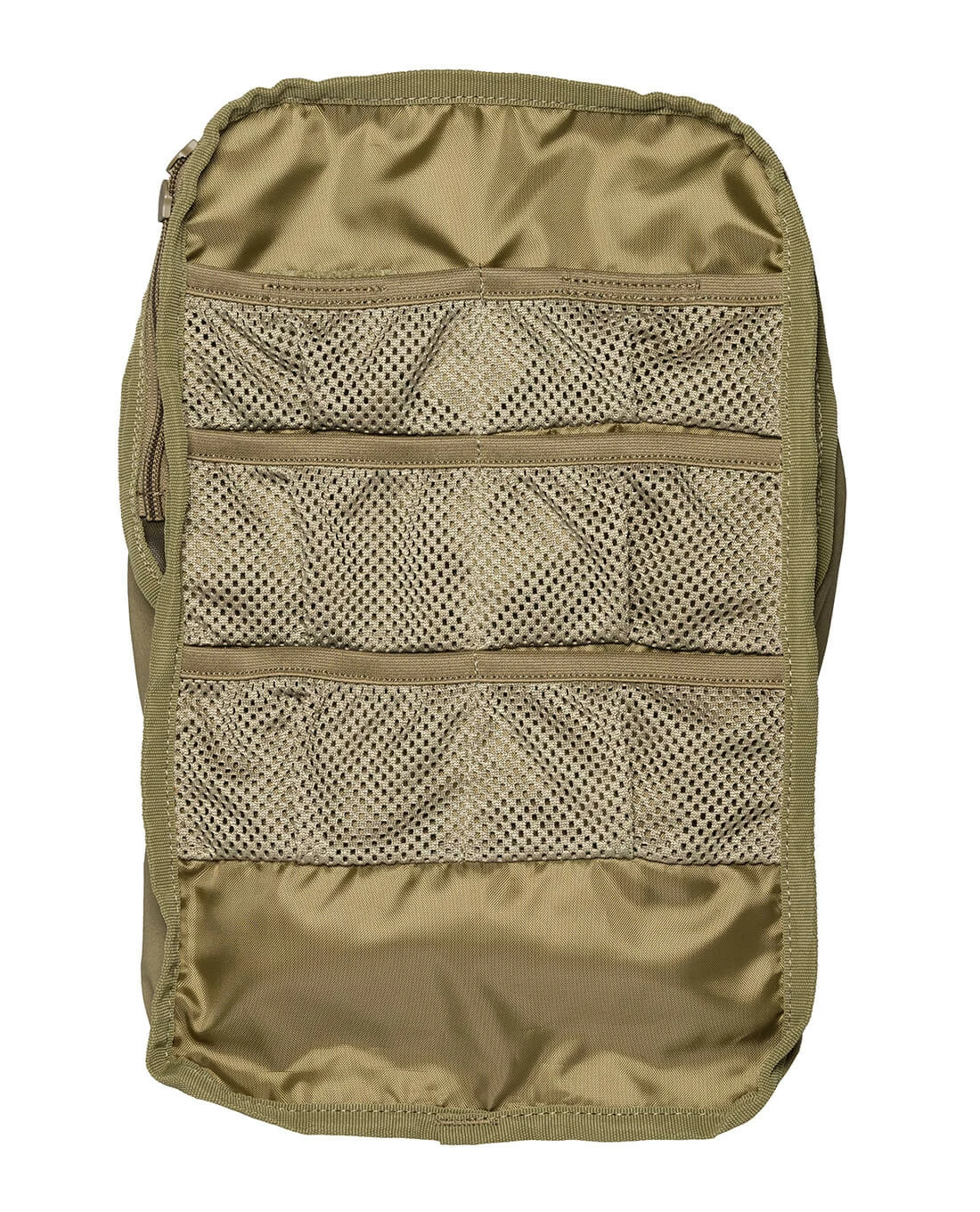 Die Tasche aus CORDURA 700 den ist robust und vor allem vielseitig zu beladen: Das große Hauptfach wird über den nahezu vollständig umlaufenden Reißverschluss erreicht. Elastische Kordelbänder, Gurtbänder und eine Netztasche im Inneren sind für das Aufbewahren von kleinteiliger Gear angebracht. Ein M.O.L.L.E.-Klett bietet weitere Möglichkeiten zur Befestigung. Weil sich der Inhalt so separieren und sicher verstauen lässt, kann die Tac Pouch 14 auch hervorragend für medizinisches Equipment genutzt werden.