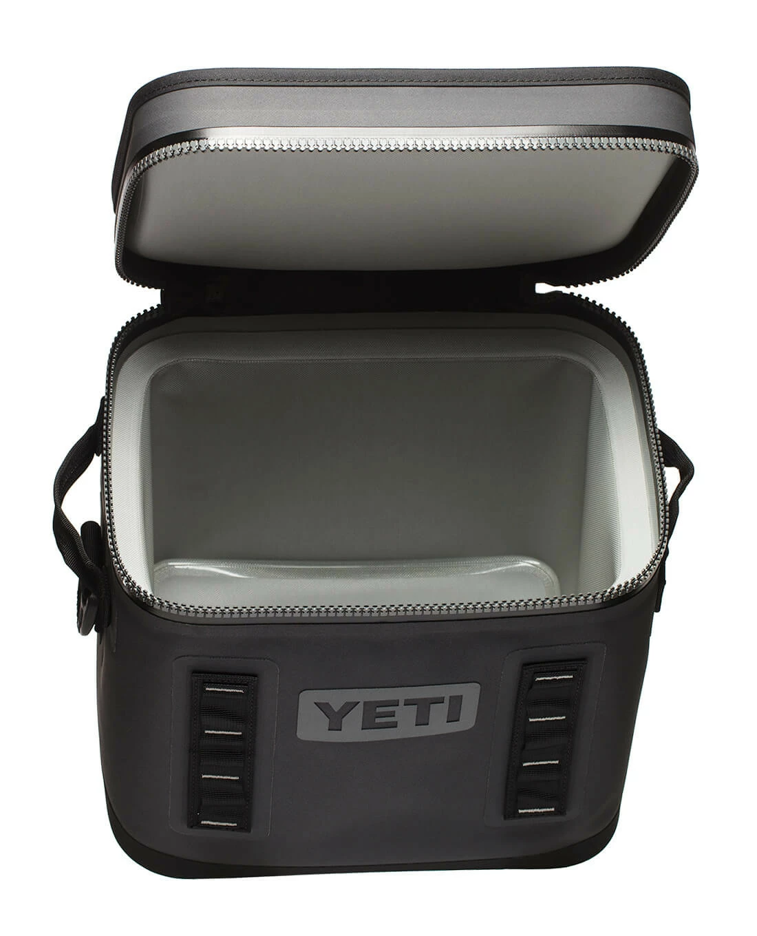 Der Deckel des Hopper Flip 12 lässt sich vollständig aufklappen und gibt das lebensmittelsichere Innere preis. Ein 4lb YETI Ice Pack passt perfekt in die Tasche und kühlt den Inhalt wahlweise von oben und/oder unten. Da die Kühltasche bei geschlossenem Reißverschluss vollständig wasserdicht ist, kann man bedenkenlos normales Eis verwenden.